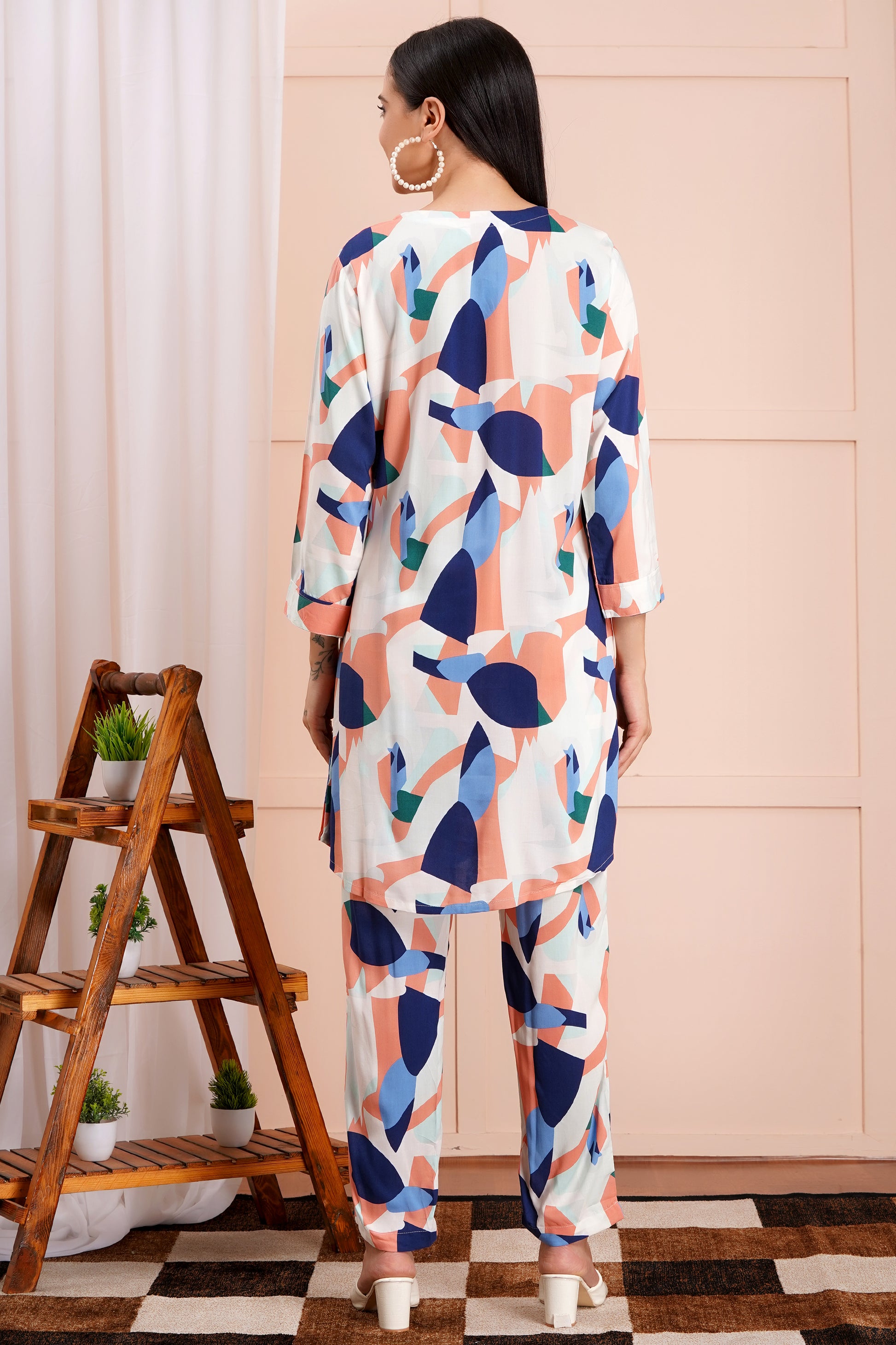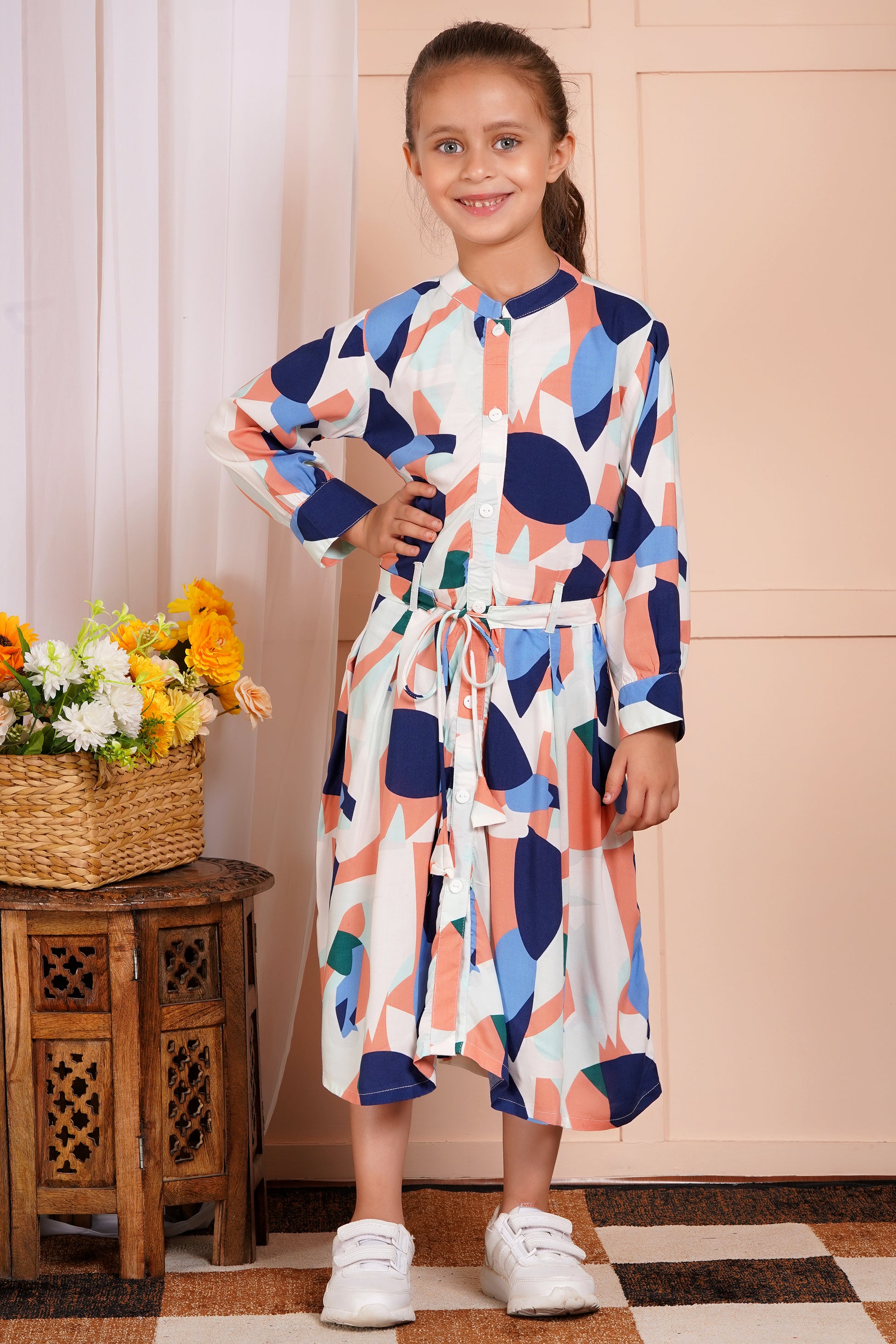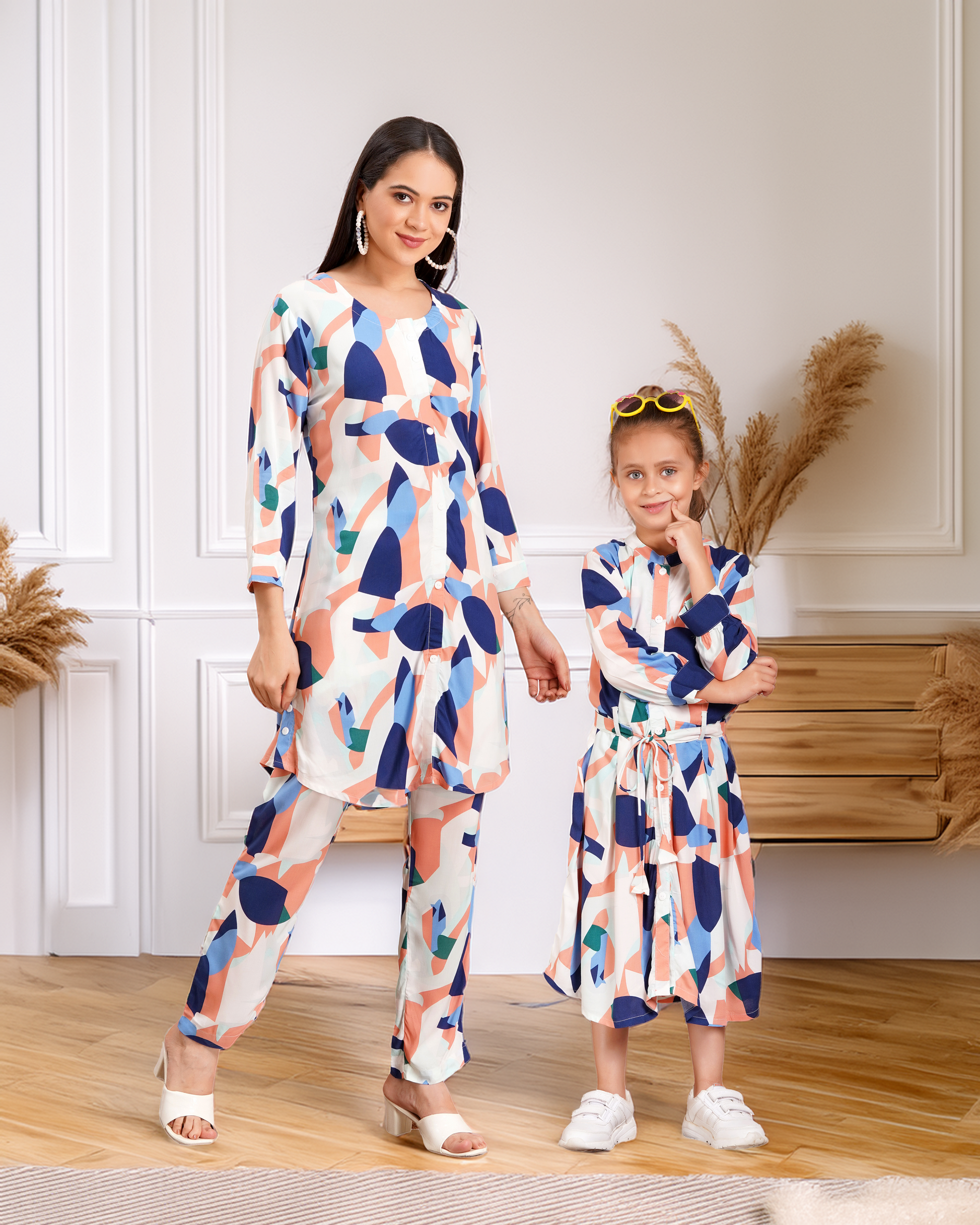 This eye-catching combo features a playful and colorful abstract print in shades of navy, peach, and teal, set against a crisp white background. Crafted from a soft, breathable fabric, it ensures comfortable wear for all her adventures and creative play. The dress boasts a neat mandarin collar and a full-button placket for easy dressing, while the long sleeves provide a stylish and comfortable fit. A self-fabric tie-up belt at the waist allows for an adjustable and flattering silhouette, adding a charming detail with its tassel ends. Featuring an eye-catching print, this set blends modern elegance with effortless comfort. The relaxed-fit button-down shirt pairs perfectly with tailored straight-leg pants, creating a sophisticated yet casual look.