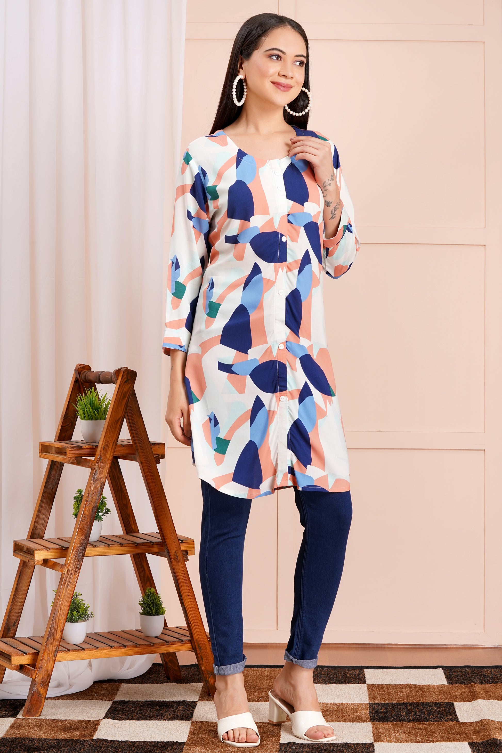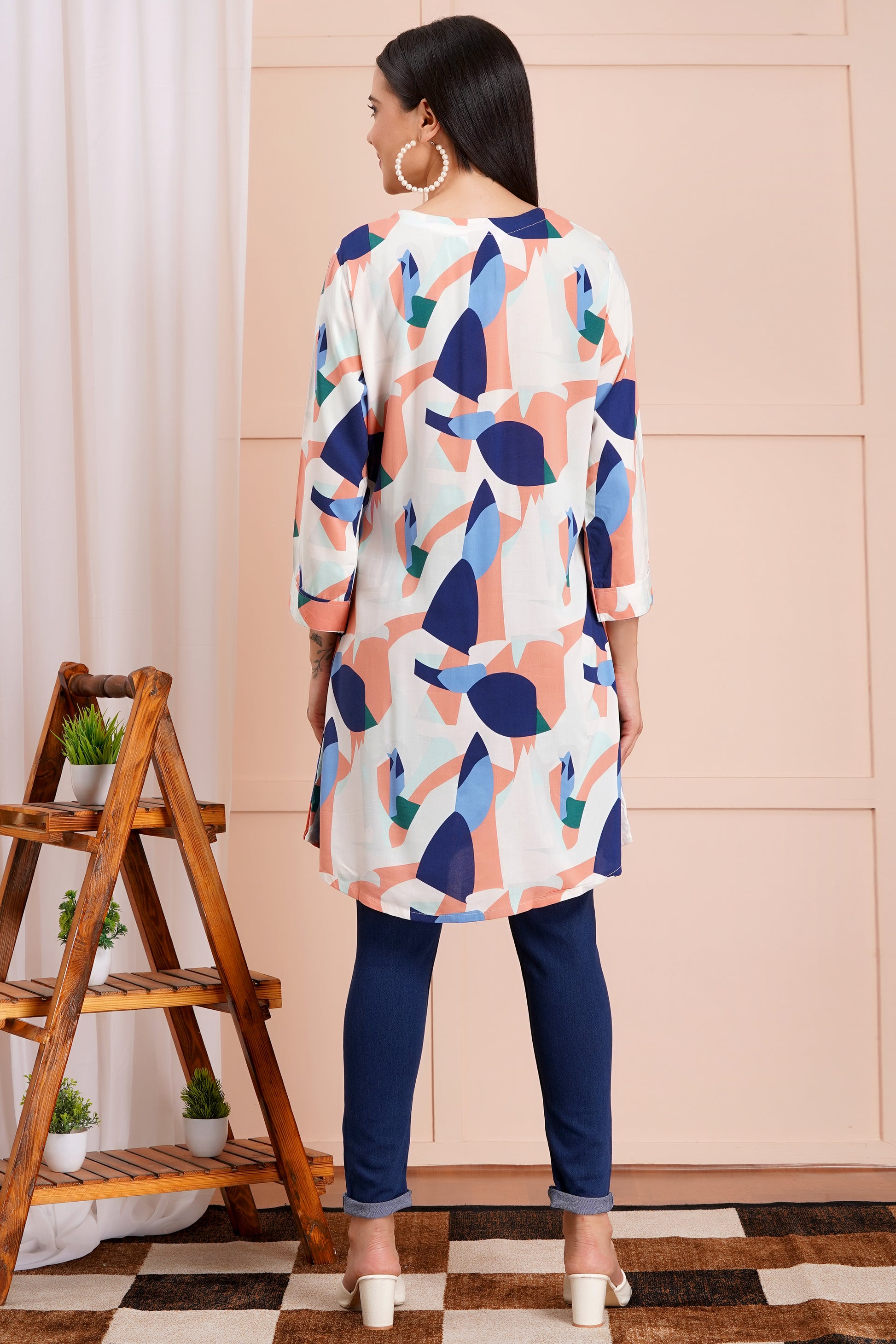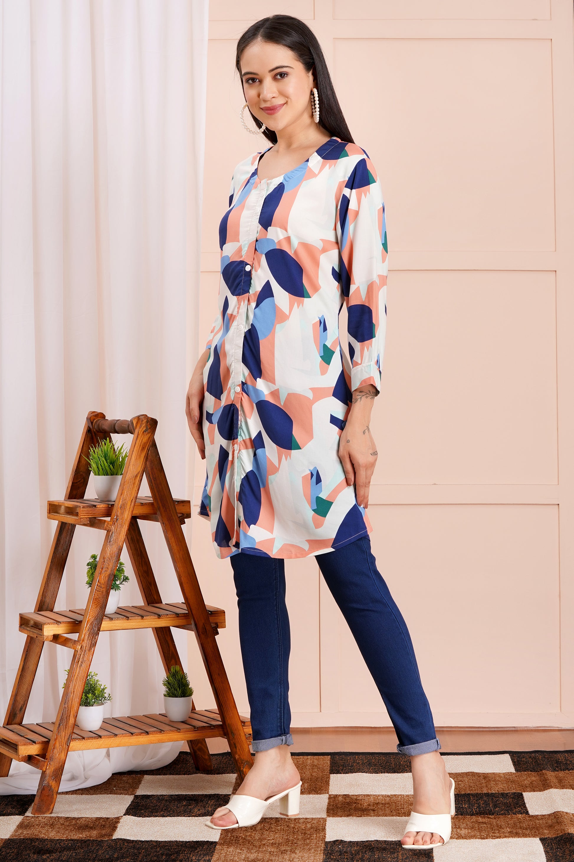 This Abstract Print Short Kurti is crafted with fine-quality viscose modal fabric, very similar yet superior to rayon fabric in terms of quality, feel, comfort, and durability. You may choose from various size options starting from M up to 4XL.