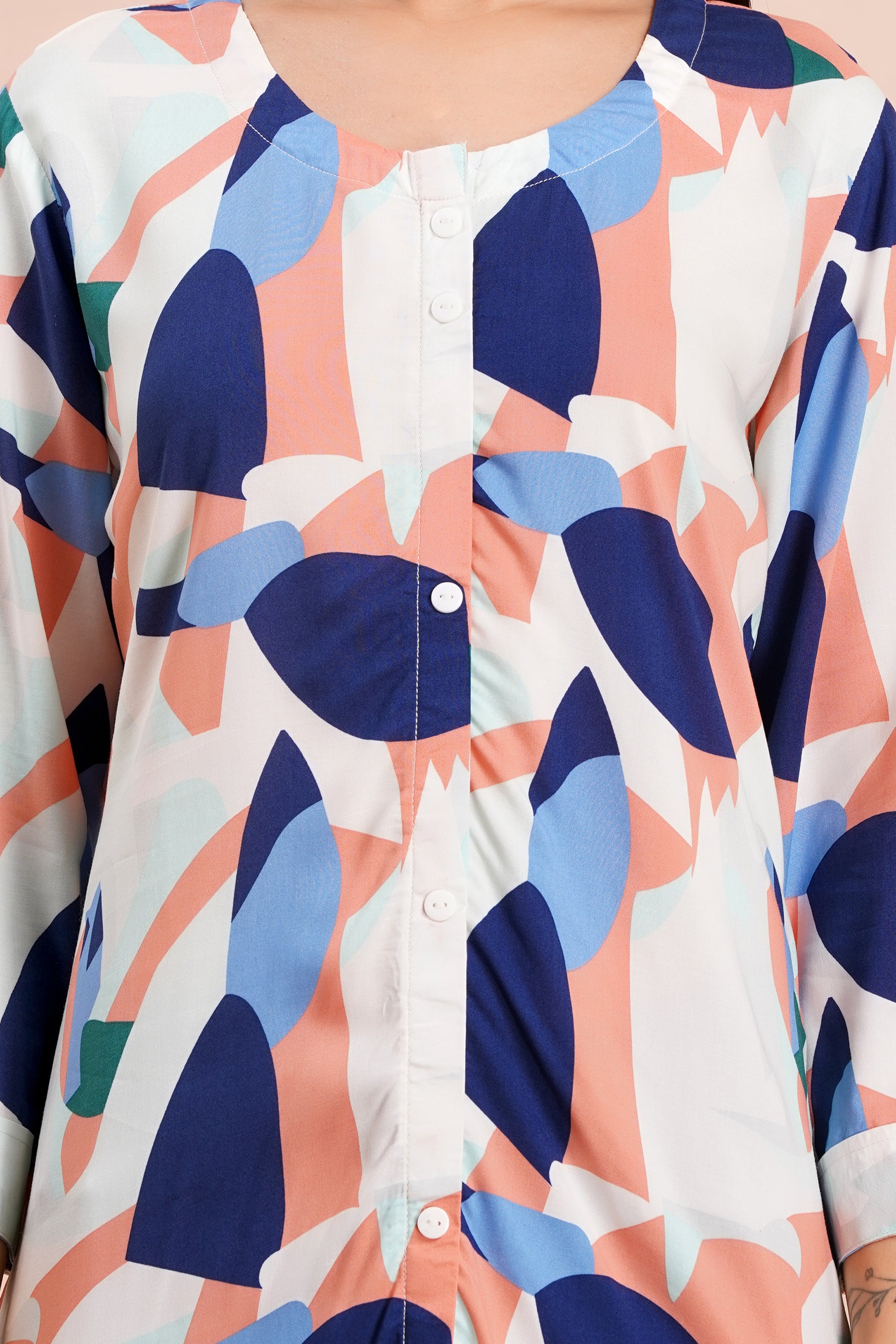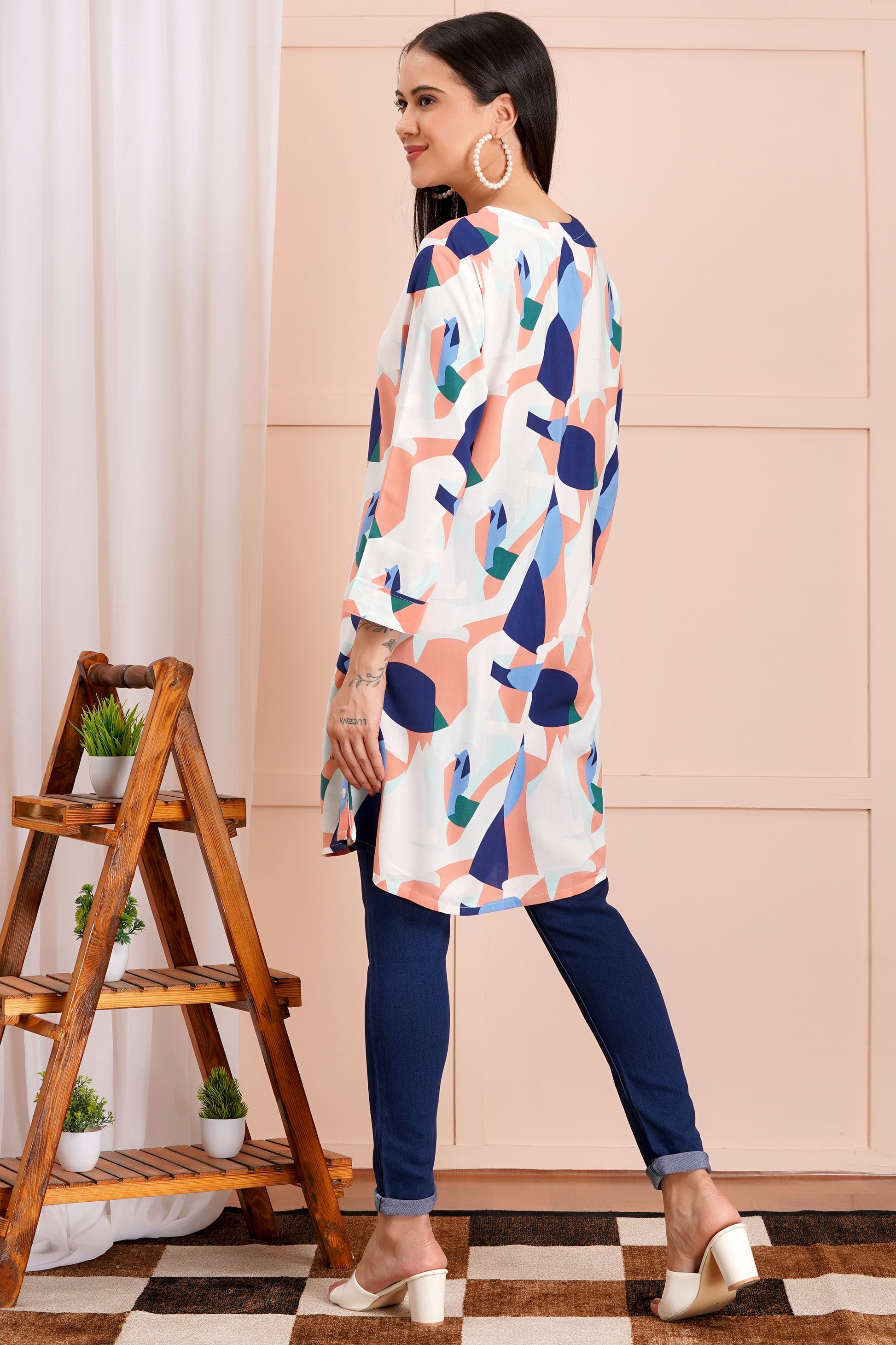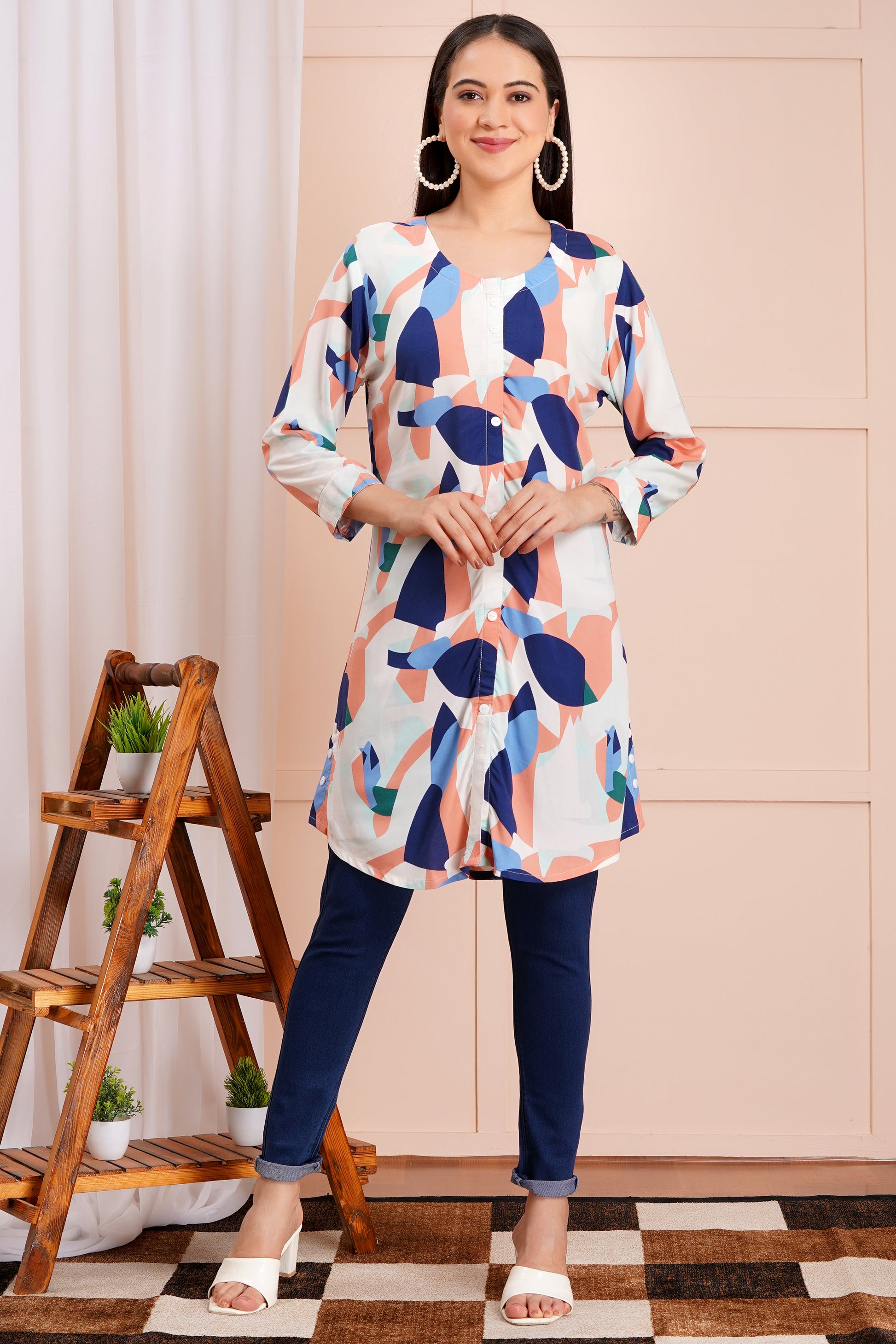 This Abstract Print Short Kurti is crafted with fine-quality viscose modal fabric, very similar yet superior to rayon fabric in terms of quality, feel, comfort, and durability. You may choose from various size options starting from M up to 4XL.