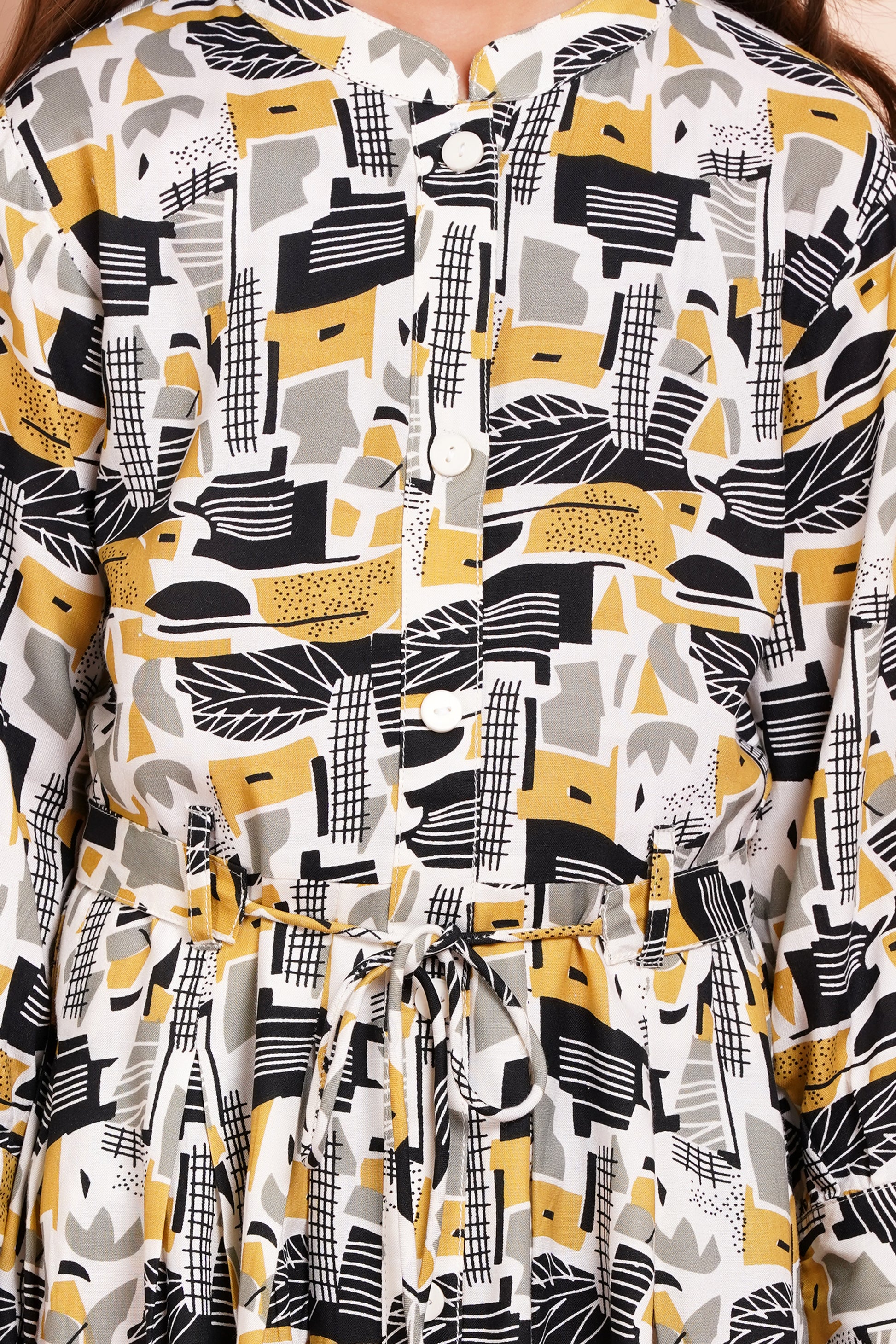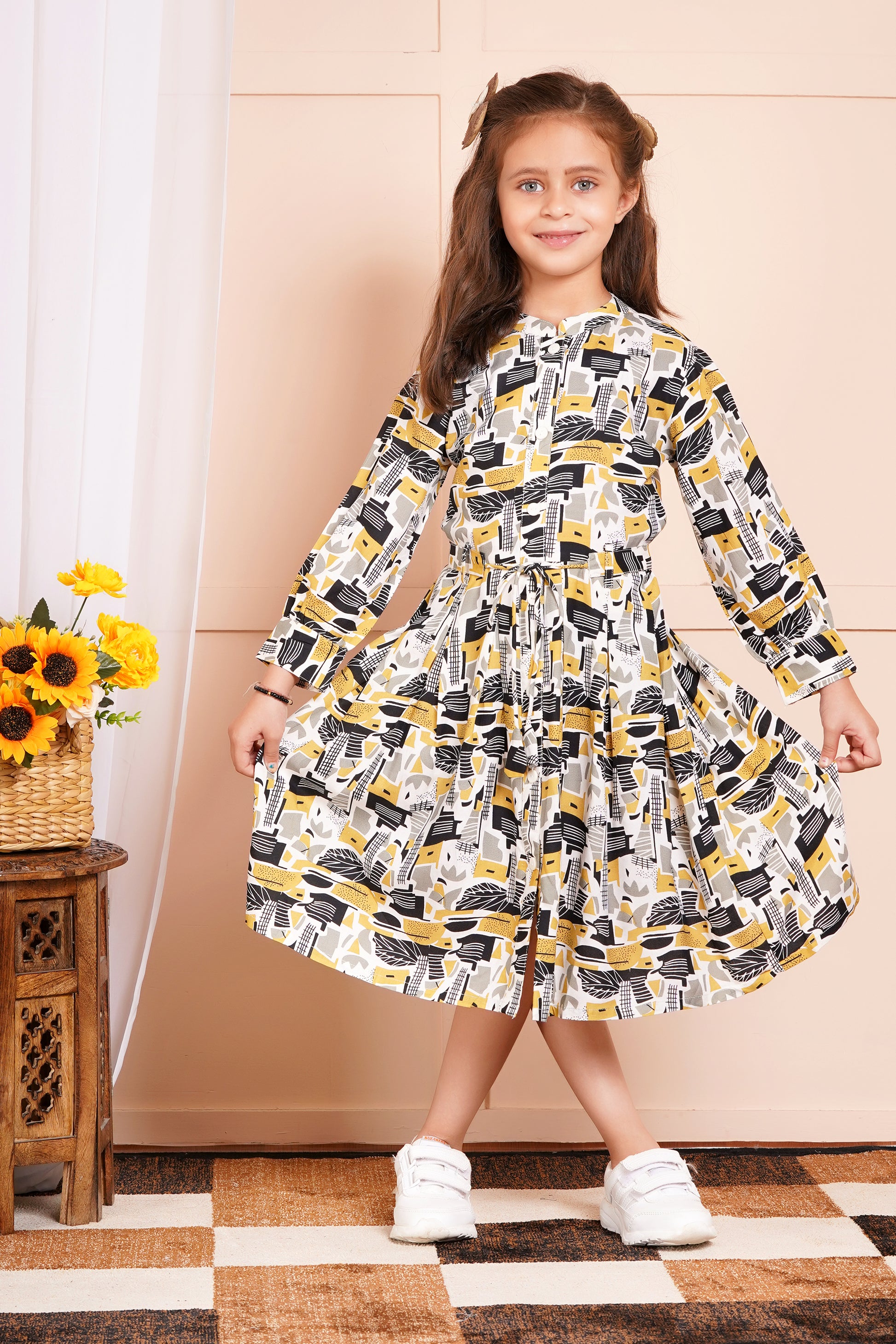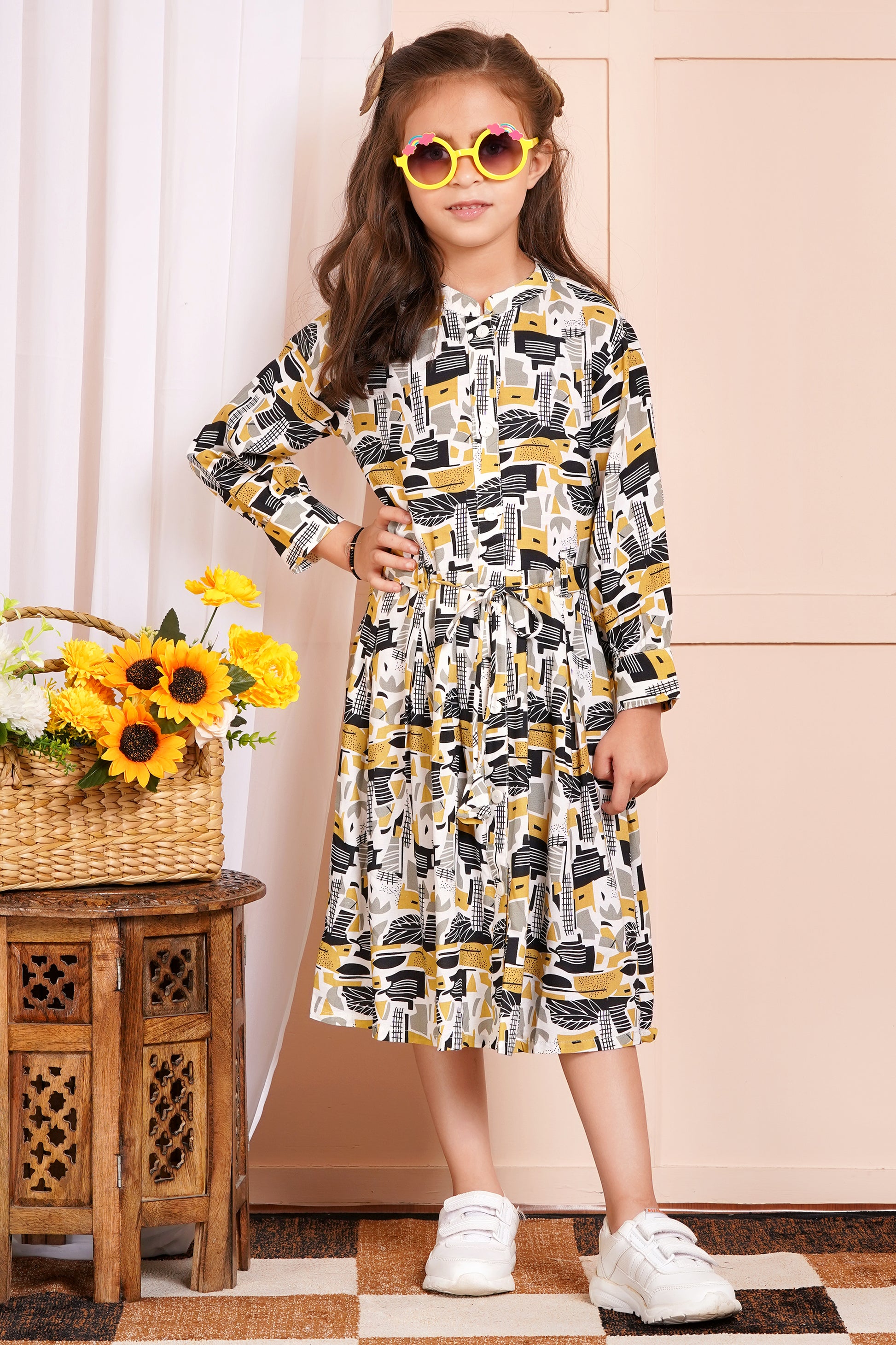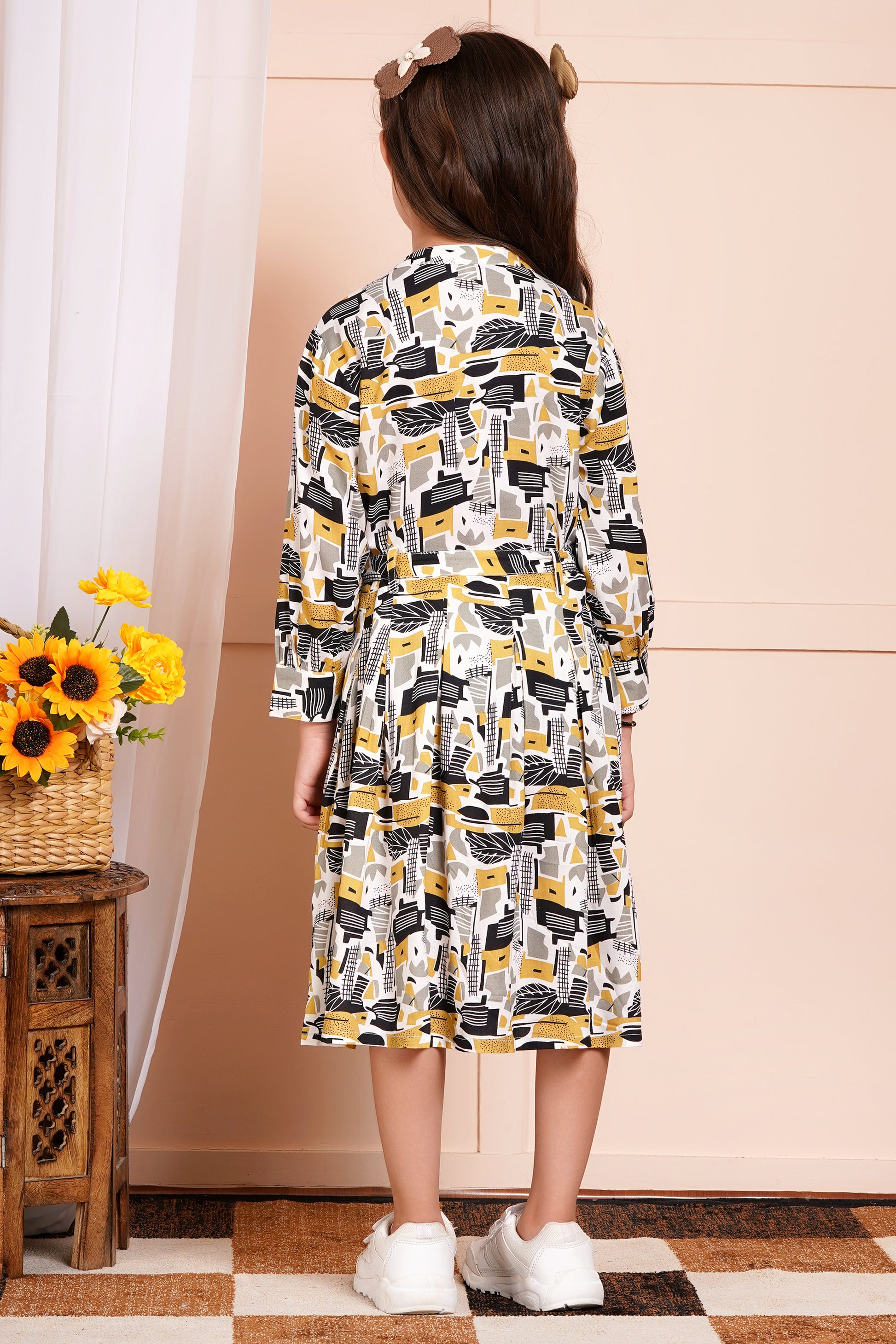 Add a dash of modern flair to your little one's wardrobe with the Abstract Print Belted Dress. Featuring a unique abstract print in striking tones of mustard yellow, black, white, and grey, this dress blends playful energy with a trendy, city-chic vibe. It’s the perfect pick for style-forward kids who love to stand out! Made from lightweight, breathable fabric, this shirt-style dress is designed for all-day comfort. The mandarin collar, front button placket, and full sleeves offer a polished, smart look, while the fabric belt adds a touch of charm and gives a flattering fit. With its knee-length flared cut, it allows ease of movement—great for school events, day outings, or festive moments. Just pair it with sneakers or ballerinas to complete her effortlessly cool look.