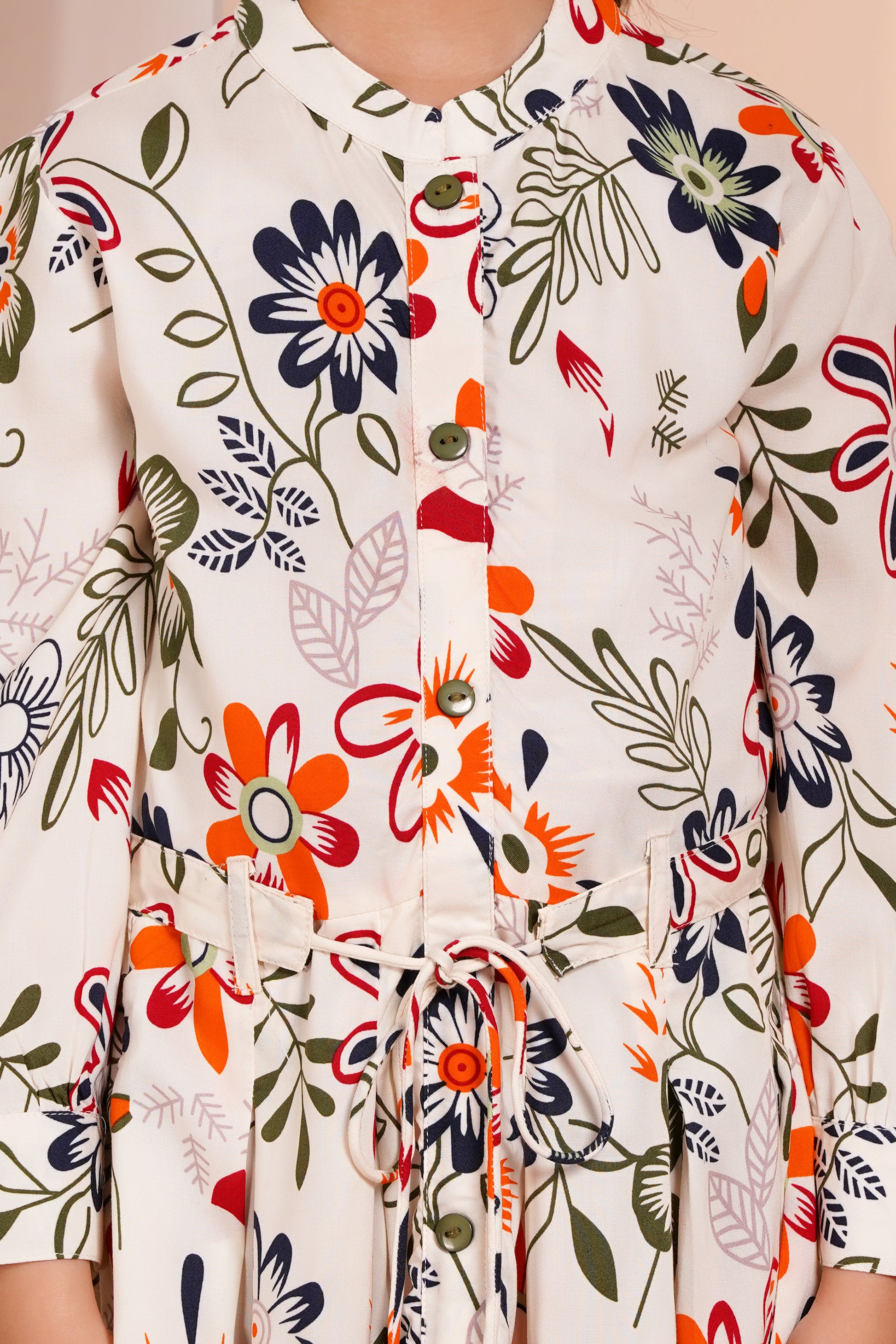 Let her radiate joy in our enchanting Autumn Bloom Belted Dress! This beautiful off-white dress is adorned with a charming floral and leafy print in warm, inviting shades of orange, navy, and green, evoking the beauty of a blossoming garden. Crafted from a soft, breathable fabric, it ensures comfortable wear for all her adventures. The dress features a neat mandarin collar and a full-button placket for easy dressing, while the long sleeves provide stylish coverage. A self-fabric tie-up belt at the waist allows for an adjustable and flattering silhouette. The graceful midi length and flowy design offer ample room for movement, making it perfect for school, family outings, or festive occasions. Sweet, comfortable, and effortlessly stylish, the Autumn Bloom dress is a delightful addition to any young girl's wardrobe, ready to brighten her day.