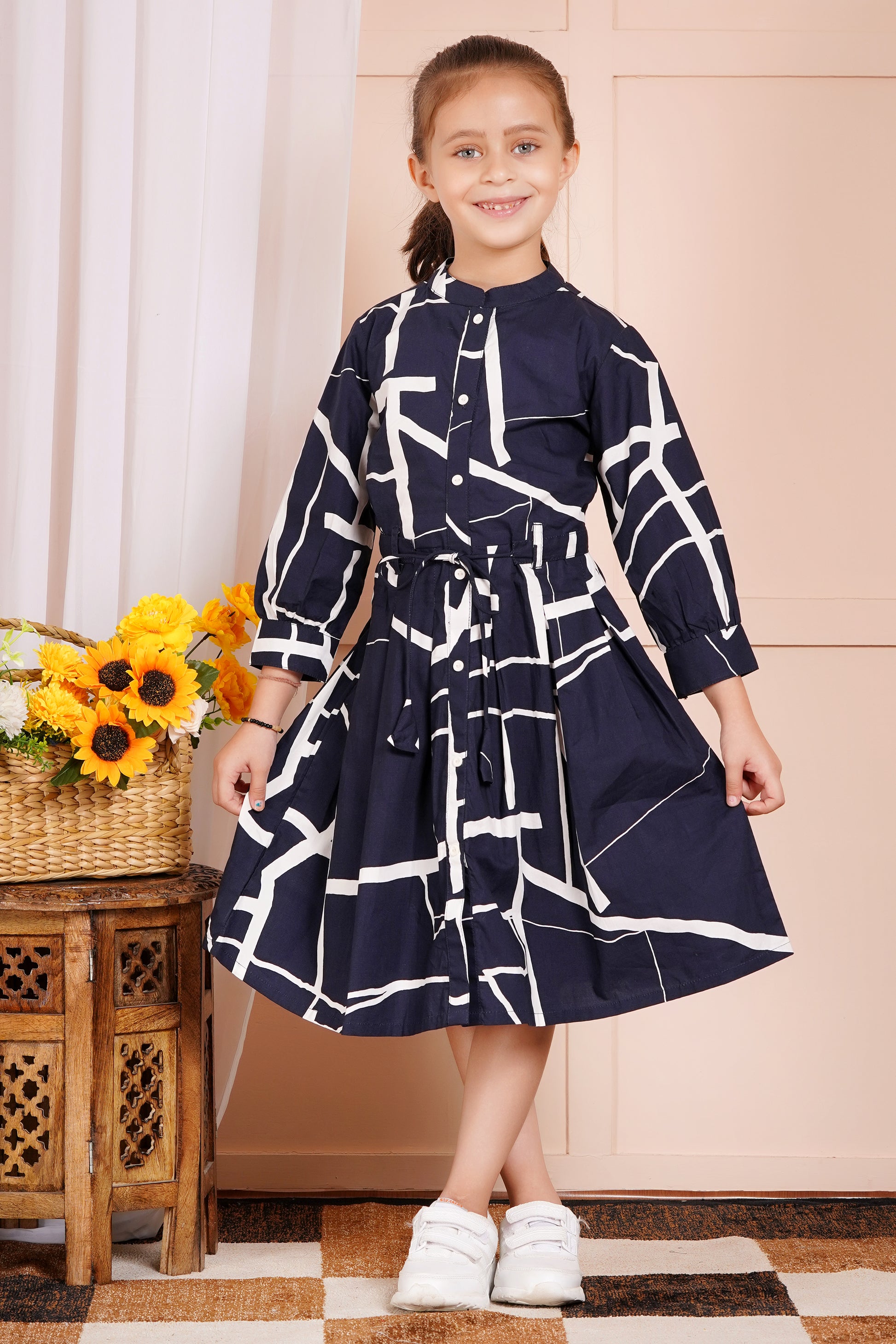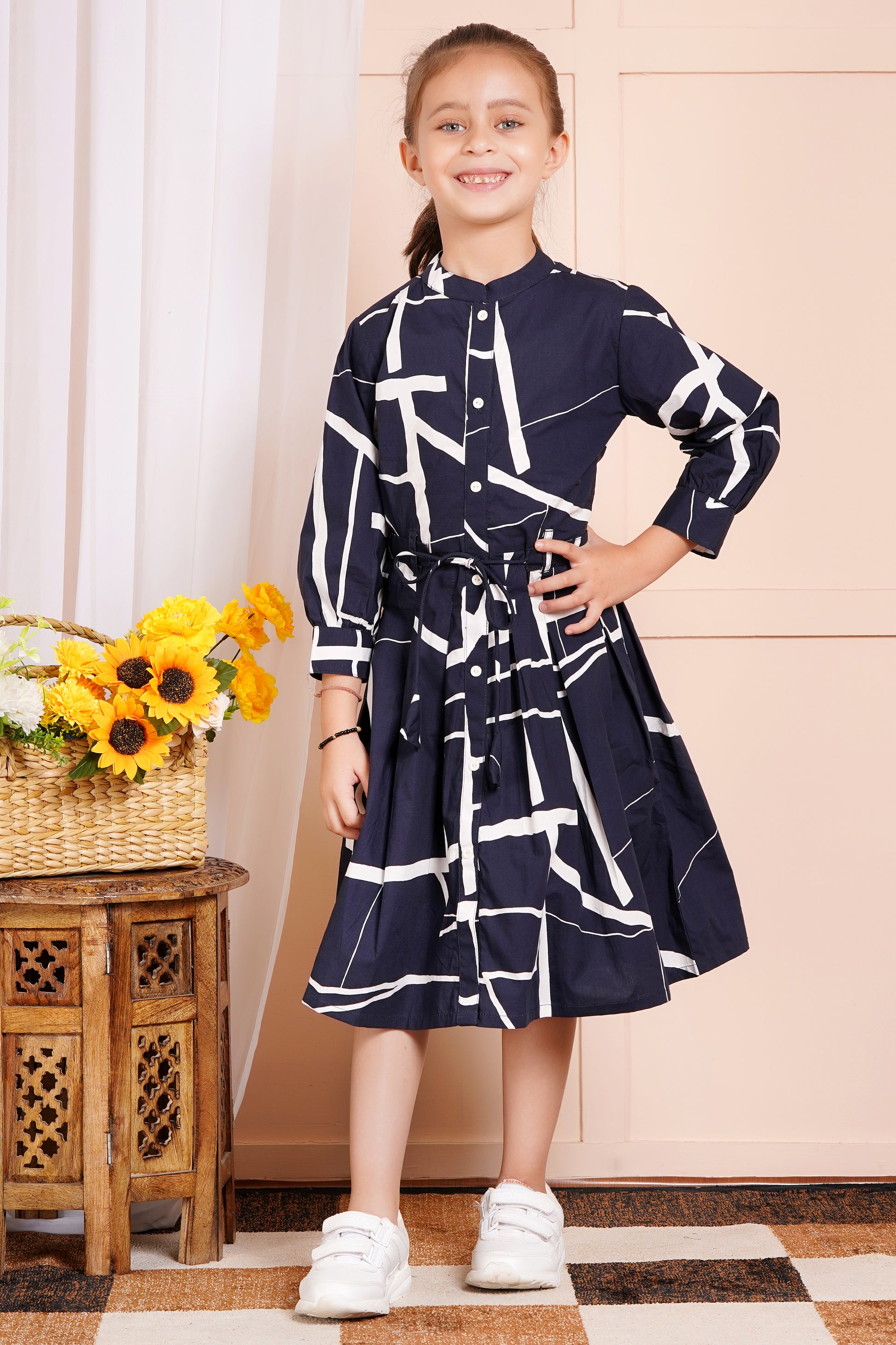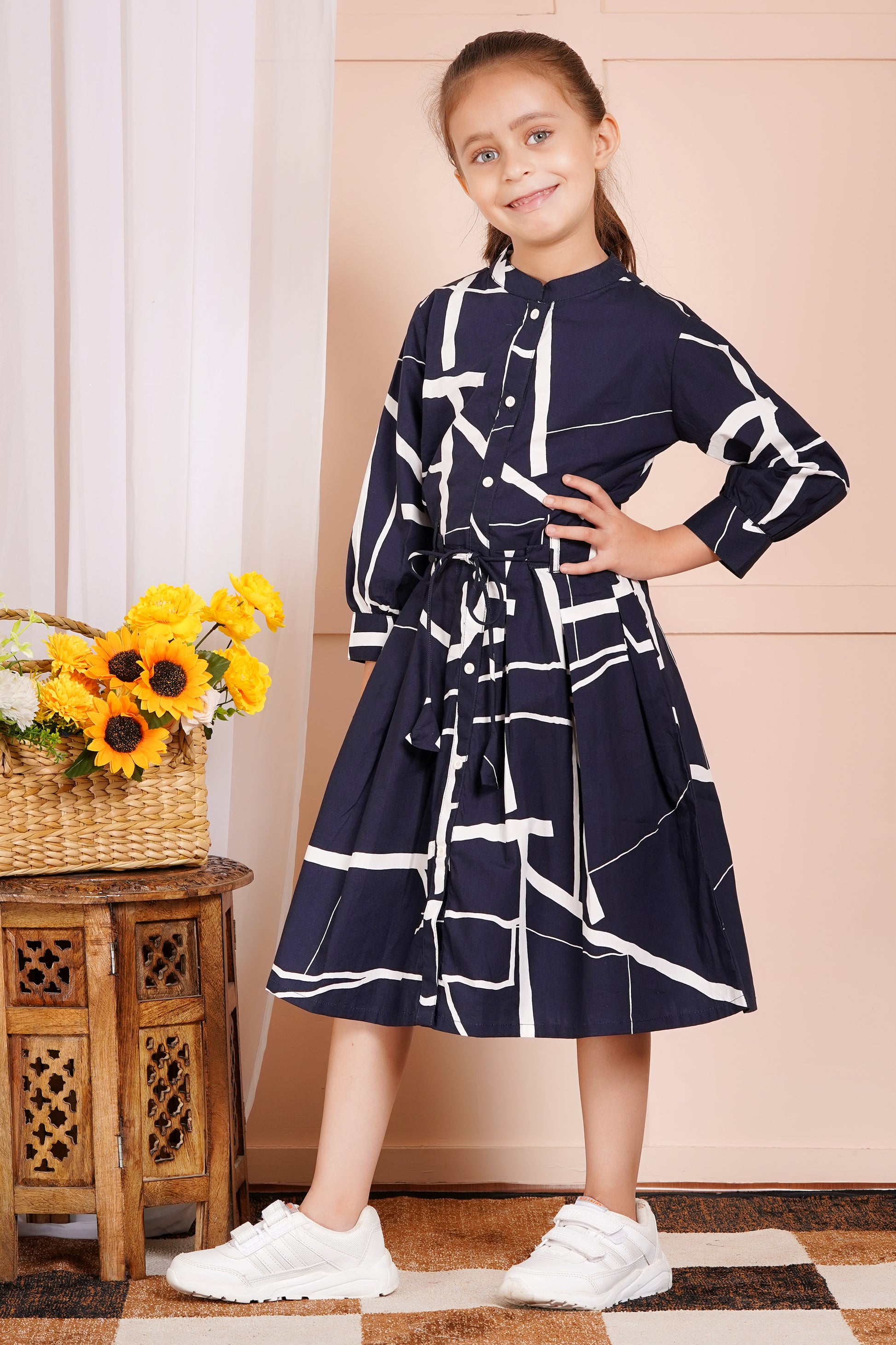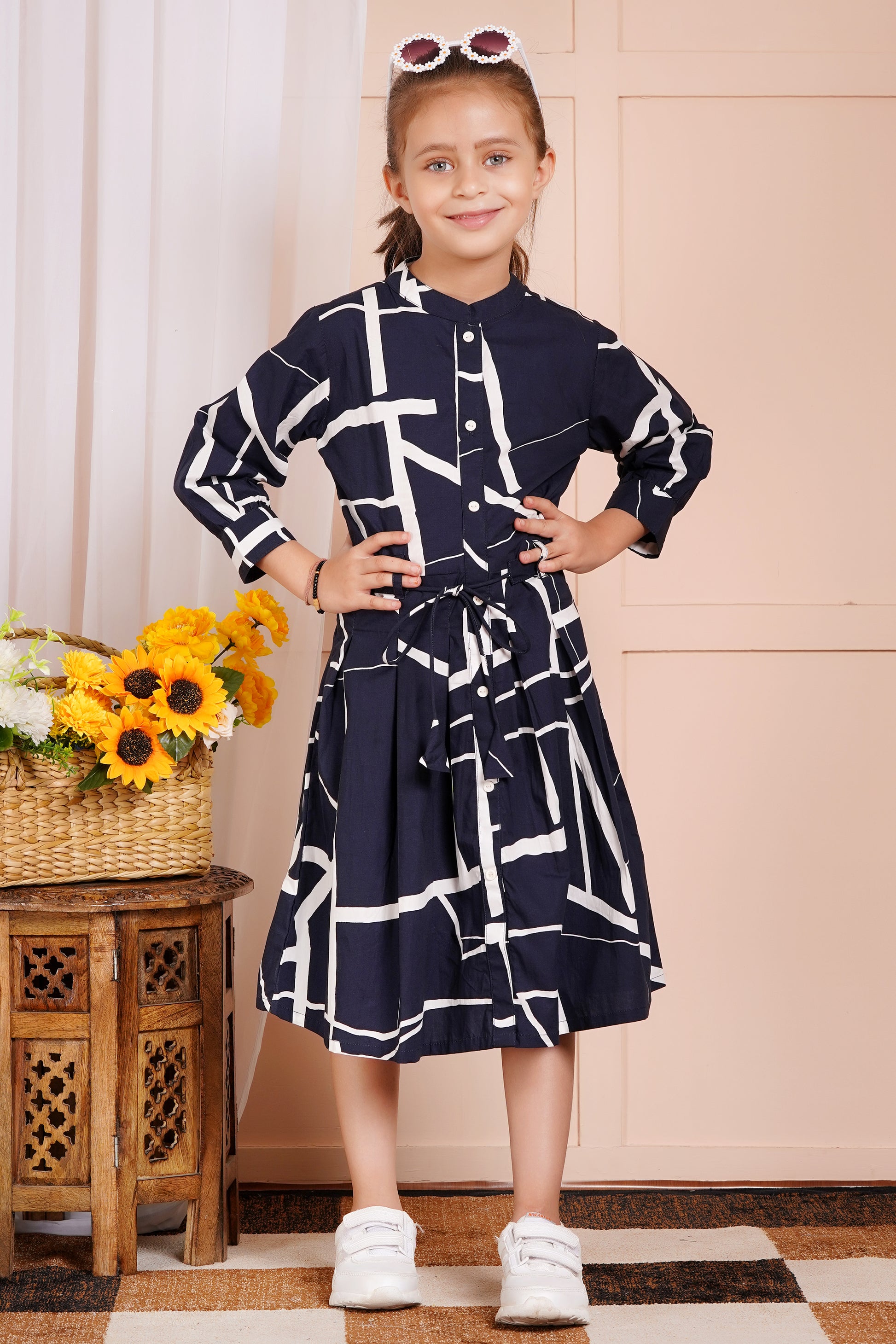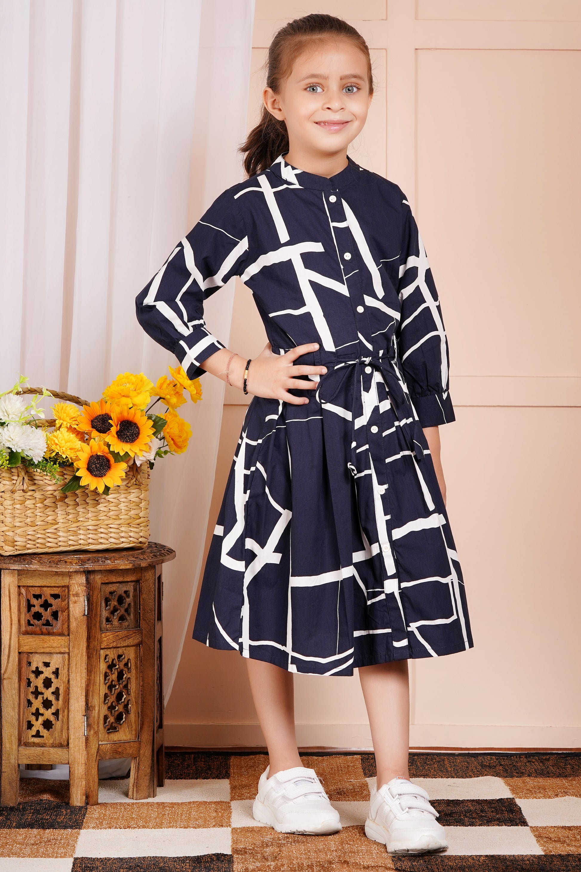 Sturdy, stylish, and exceptionally comfortable, the Geometric Chic Belted Dress is an essential addition to any young fashion enthusiast's wardrobe. Let her showcase her individual style with this delightful and versatile garment. This dress features a sleek mandarin collar and a comprehensive button placket for effortless wear, while the three-quarter-length sleeves with elastic cuffs introduce a fashionable element. A self-fabric belt ties at the waist, enhancing the figure and providing a customizable fit as she grows. The fun, flared skirt allows for easy movement, making it perfect for her lively activities. She can pair it with her favorite sneakers for a relaxed look or elevate it with sandals for a more formal event.