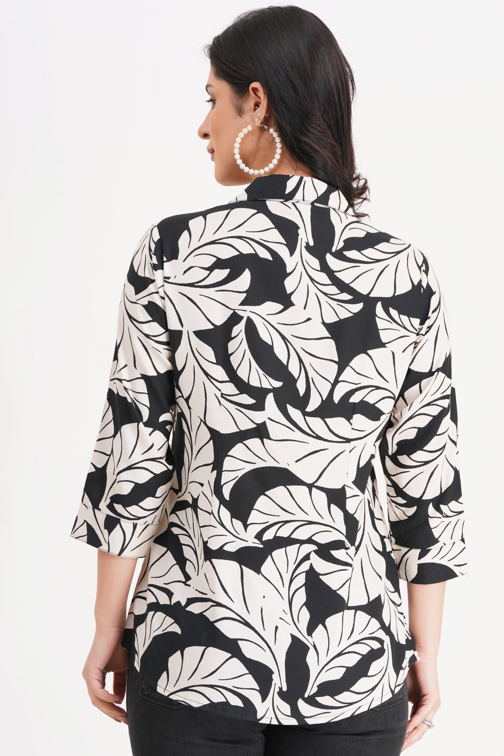 Elevate your everyday style with the Black & White Leaf Print Top by Avyarna. Designed for modern women who love effortless elegance, this tunic features a timeless monochrome leaf pattern, making it a versatile addition to your wardrobe. Crafted from breathable fabric, it ensures comfort all day long while keeping you stylish. Pair it with jeans, trousers, or skirts for a chic and sophisticated look.