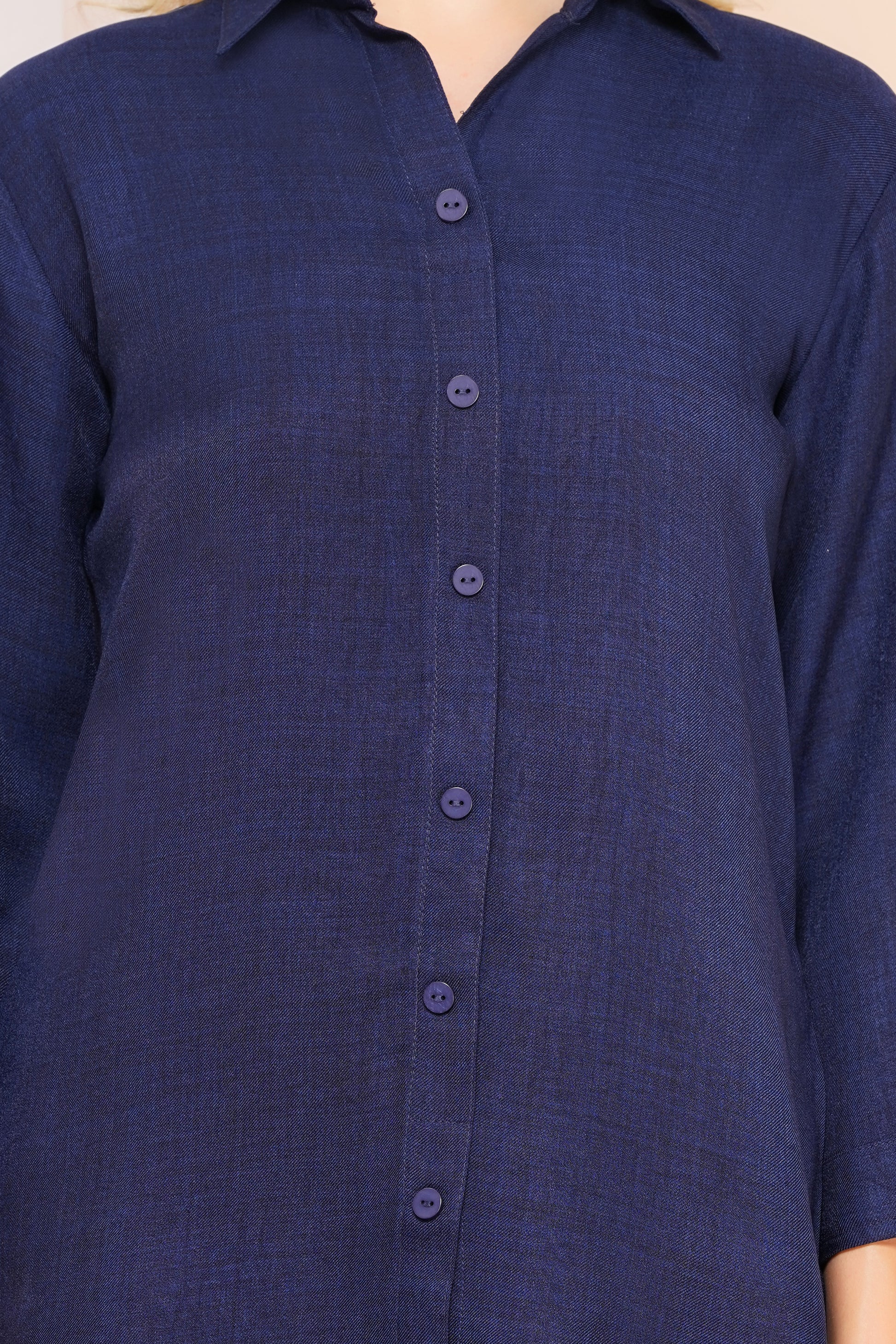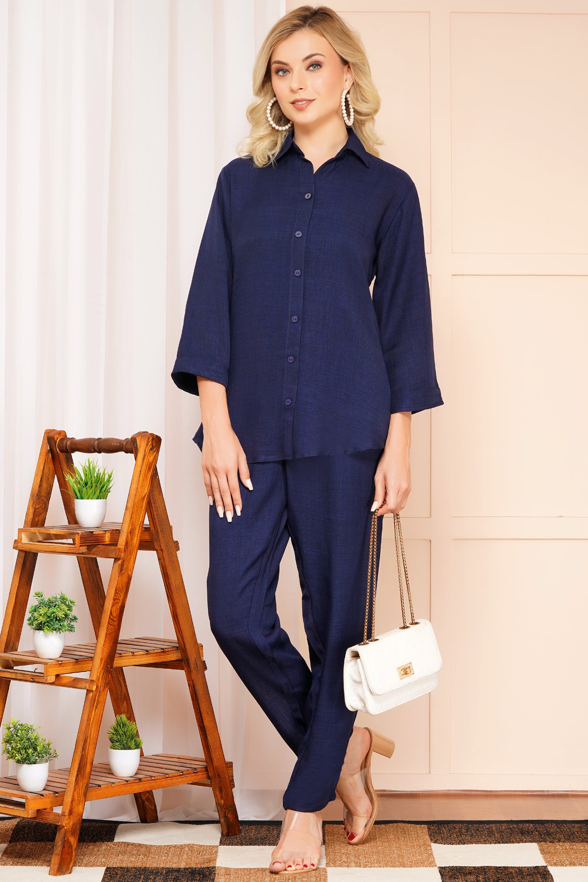 Step into style with this chic navy co-ord set, featuring a relaxed-fit button-down shirt and matching straight pants. Crafted from breathable fabric, it's perfect for both casual outings and workwear. Comfortable, classy, and timeless—your wardrobe essential! The relaxed-fit button-down shirt pairs perfectly with tailored straight-leg pants, creating a sophisticated yet casual look.
