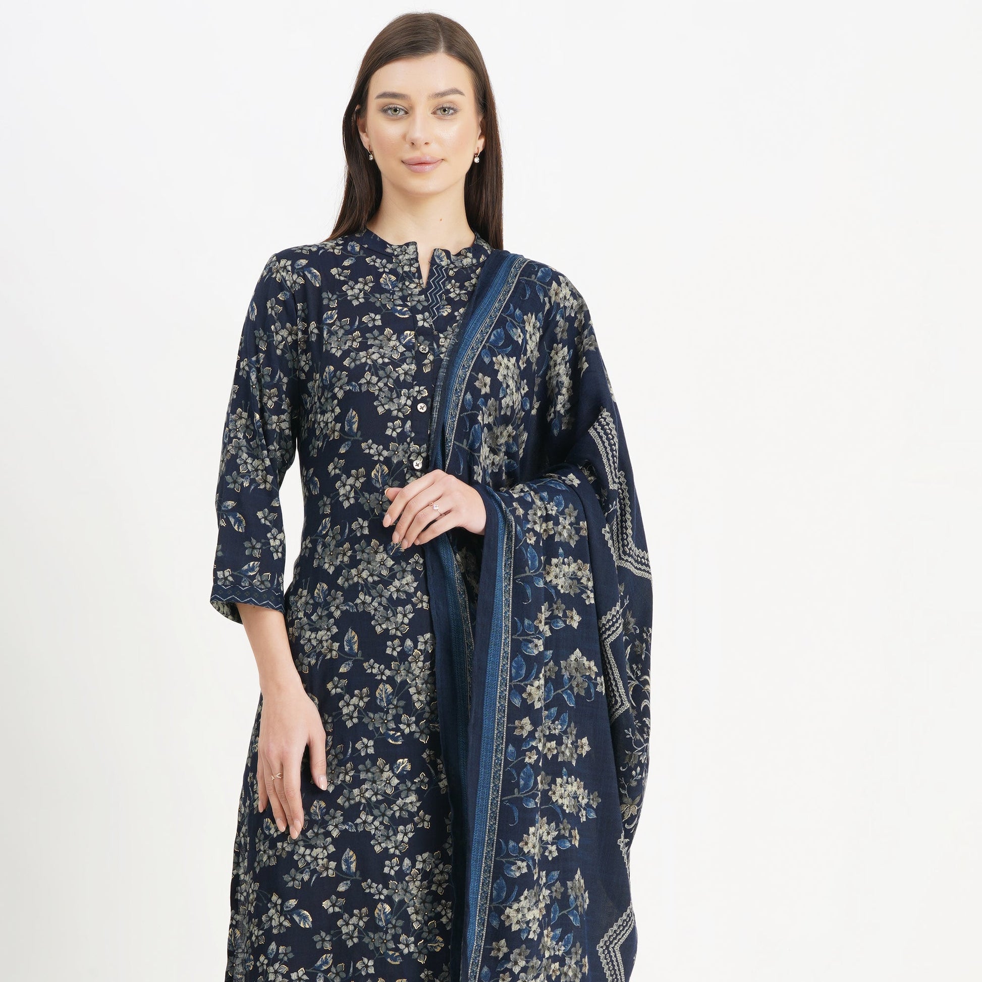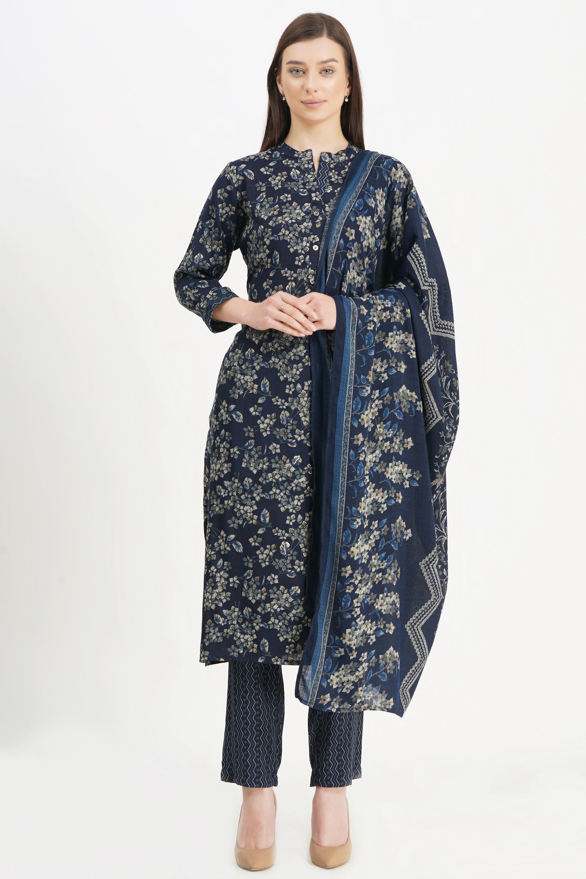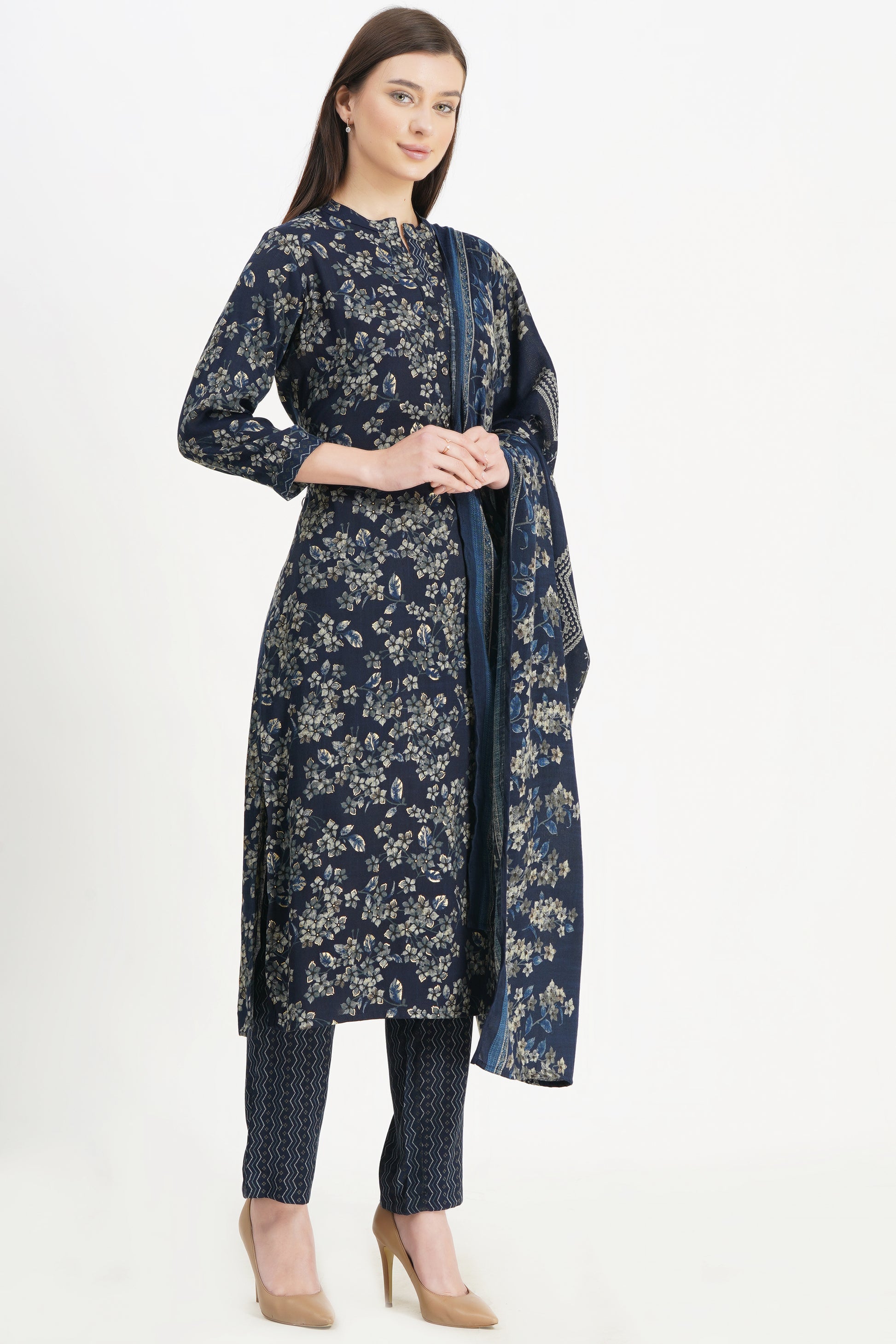 This outfit includes a three-quarter-sleeved straight kurta, matching straight-fit pants, and a dupatta with an elaborate border design that perfectly complements the kurta.