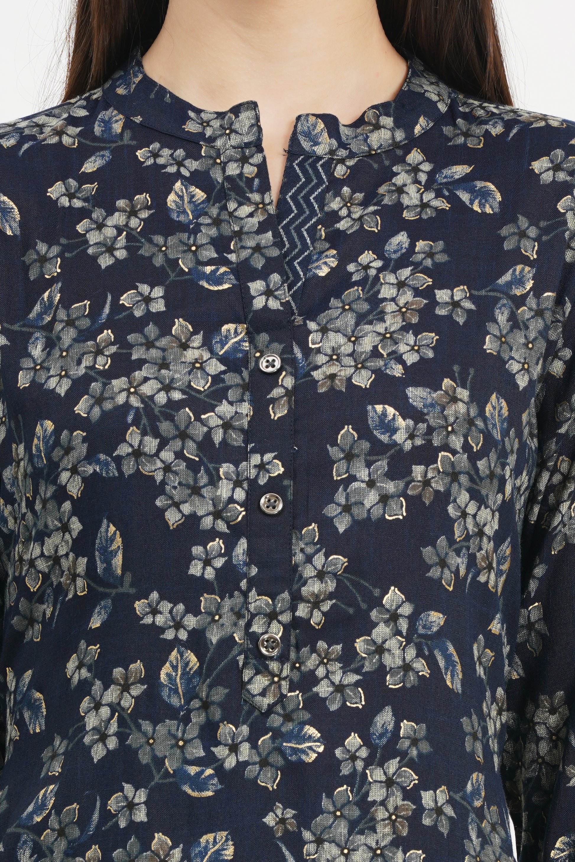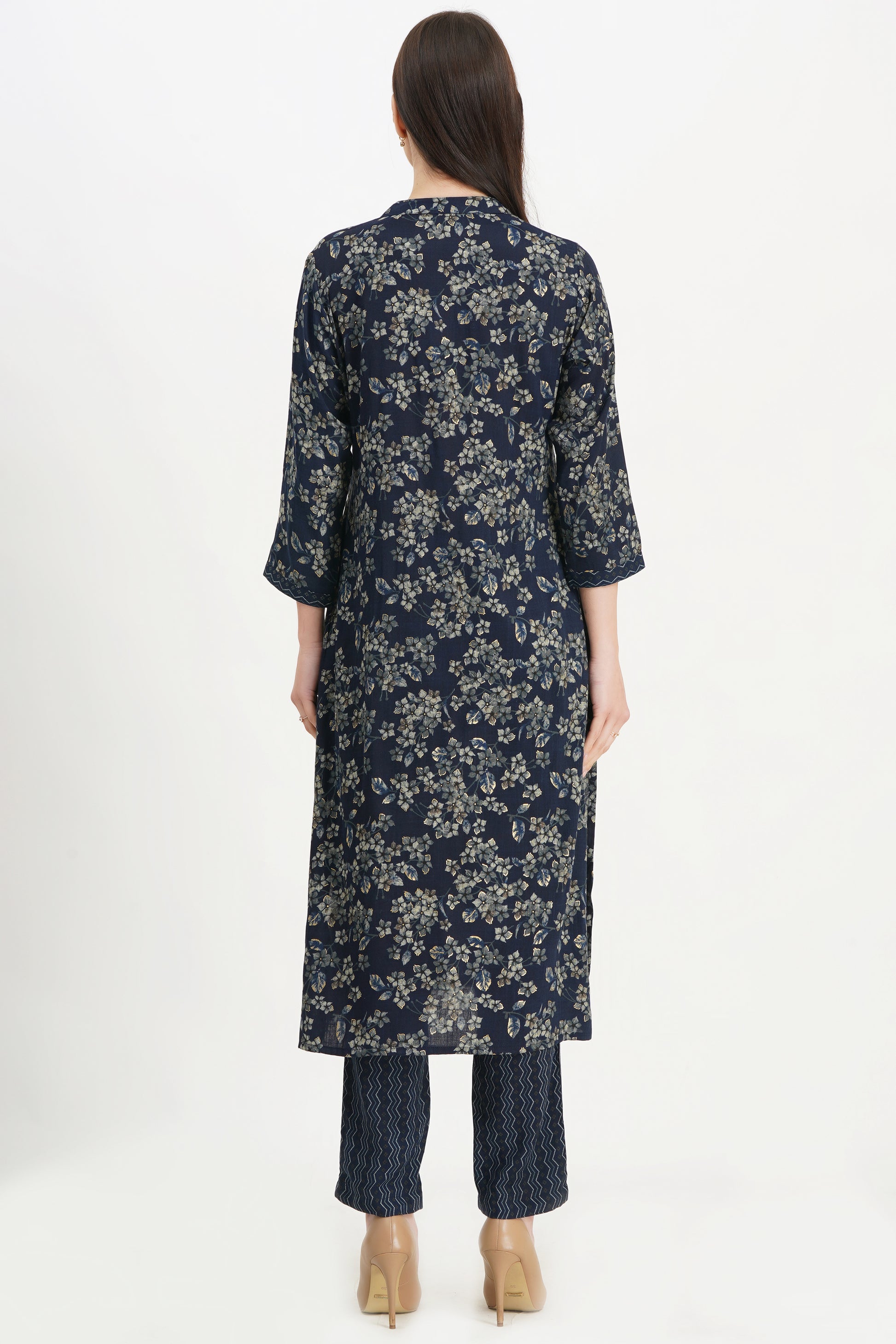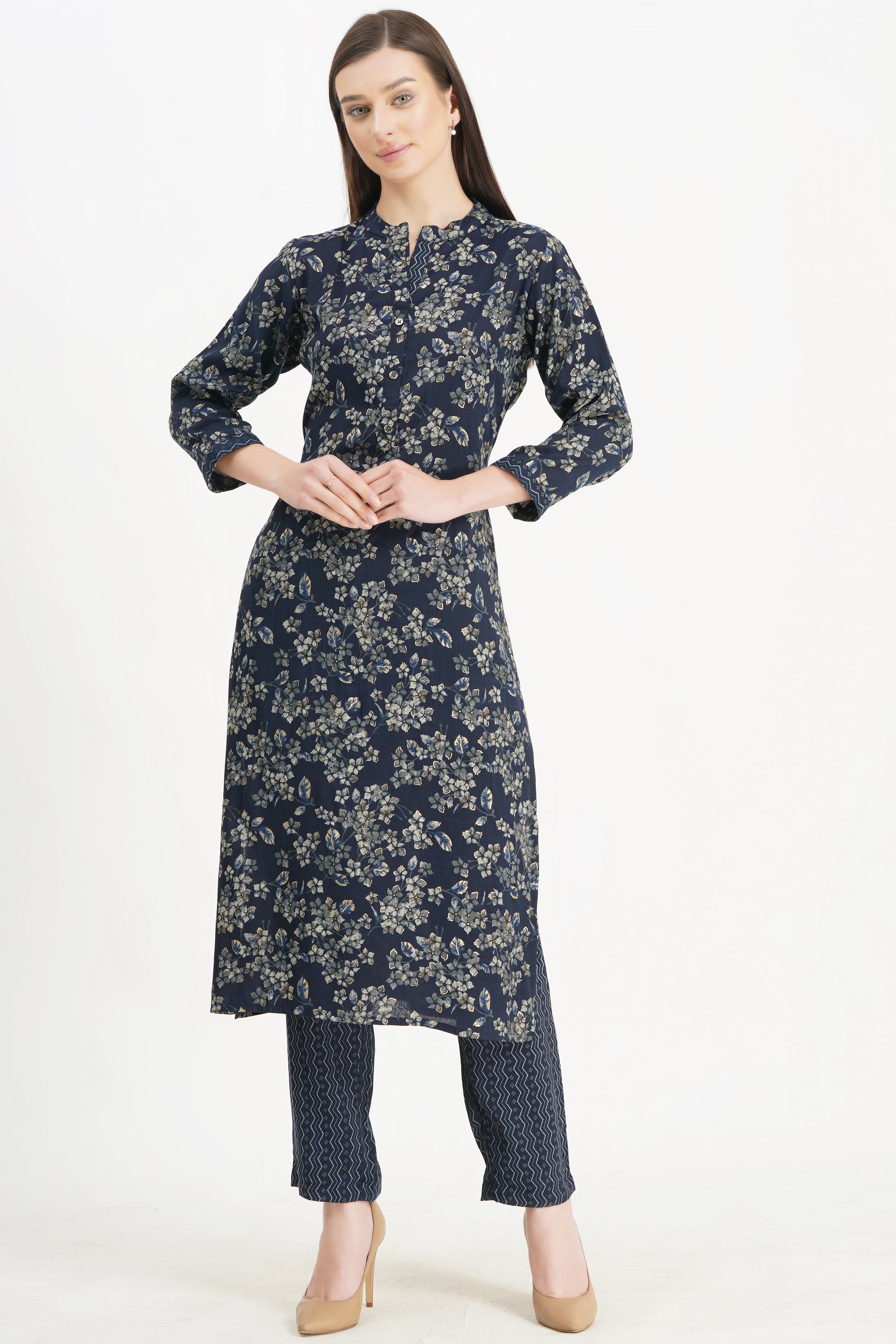 This outfit includes a three-quarter-sleeved straight kurta, matching straight-fit pants, and a dupatta with an elaborate border design that perfectly complements the kurta.