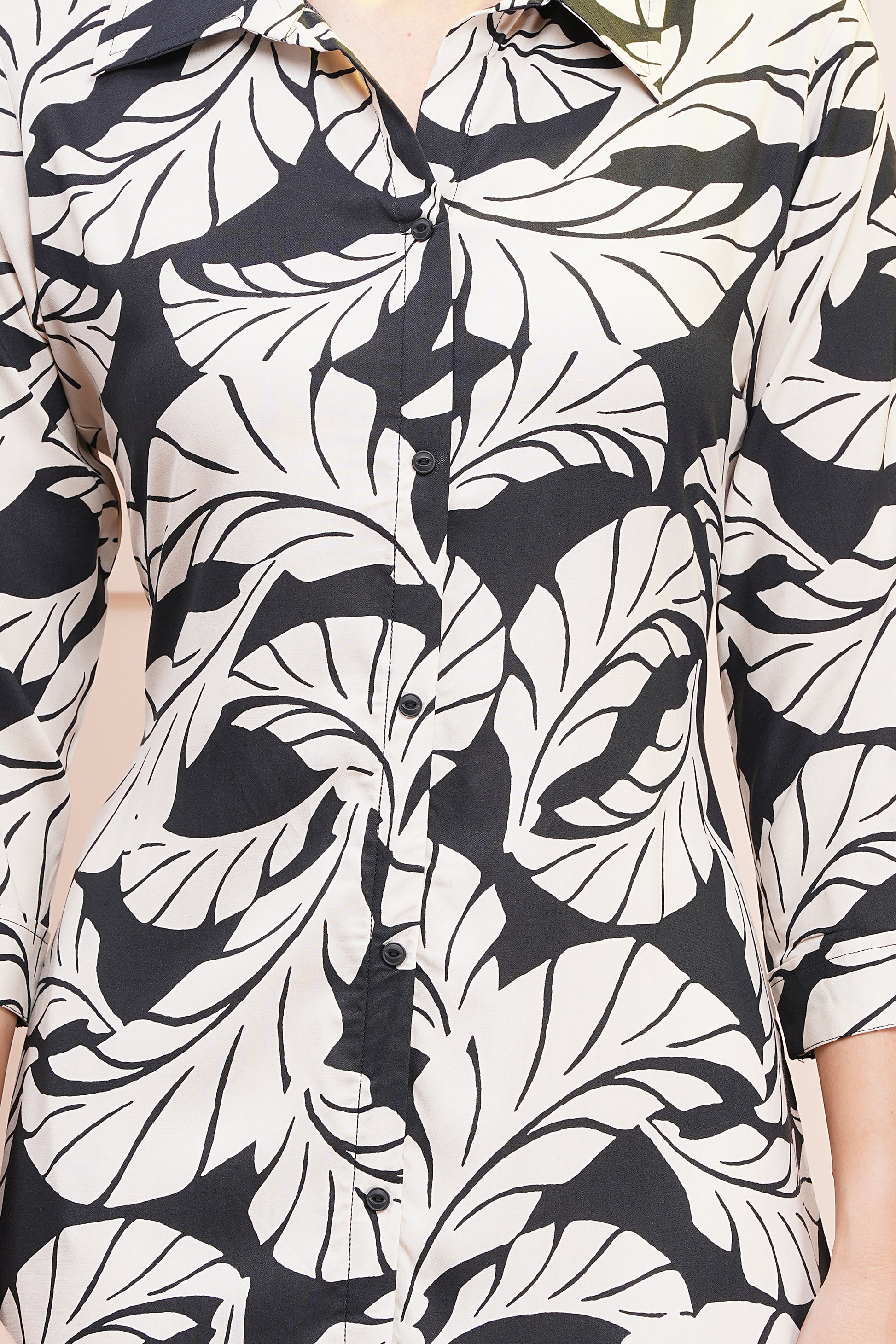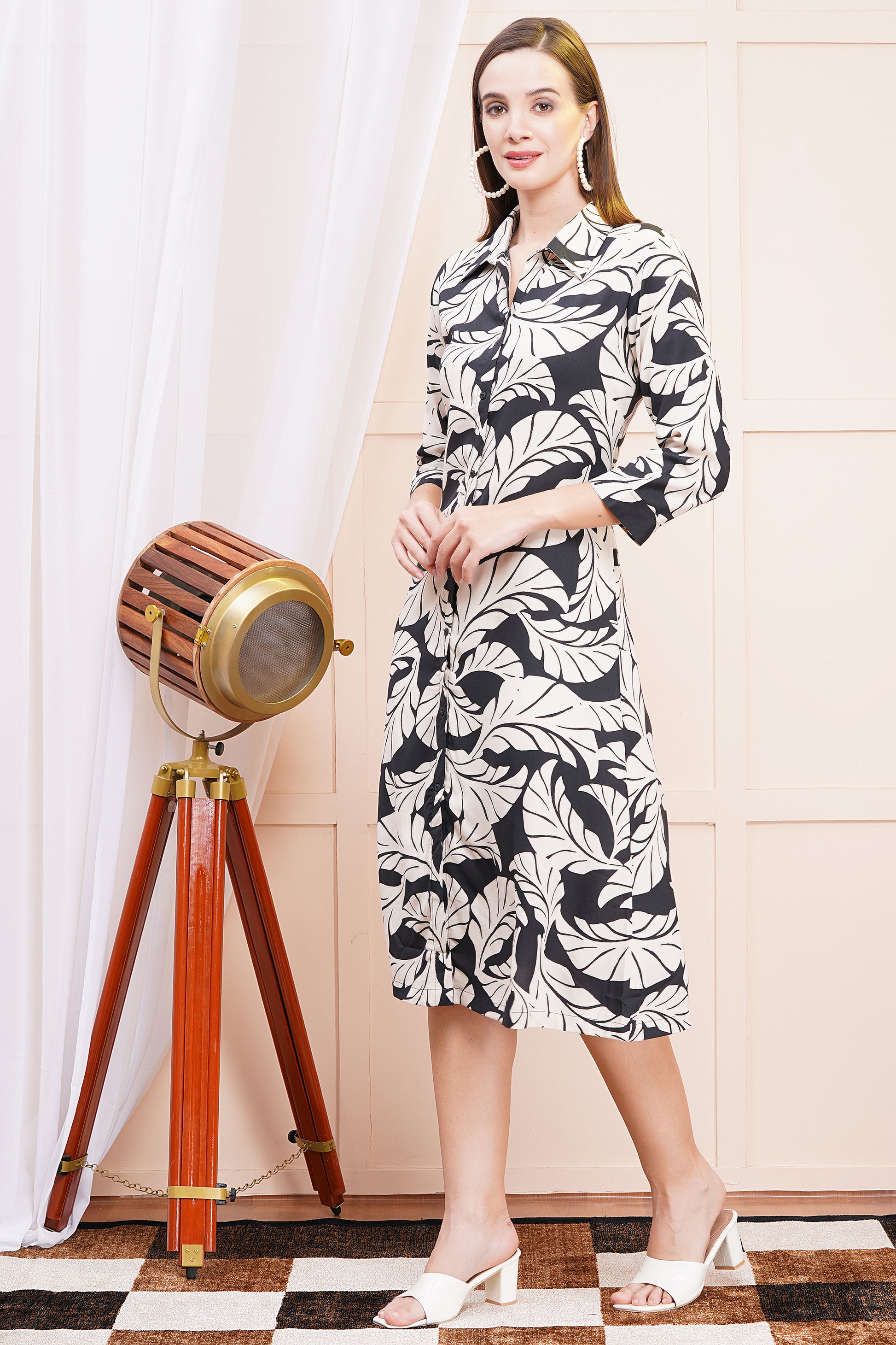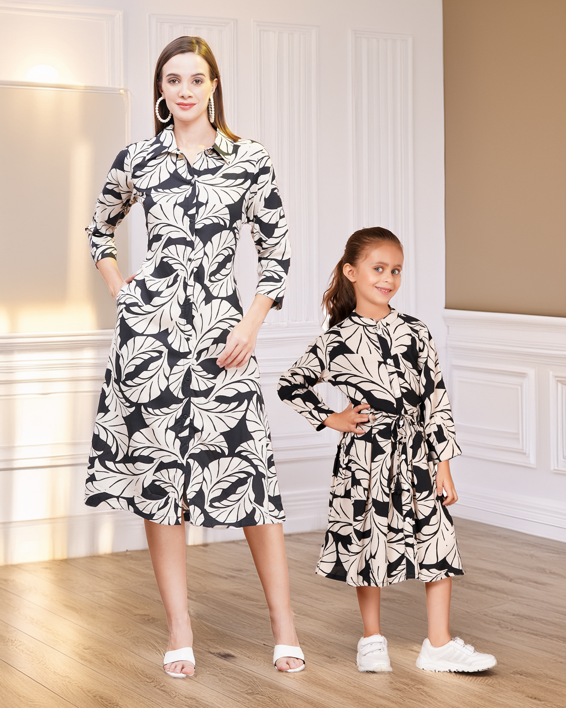 This striking combo features a beautiful black and cream botanical print, offering a sophisticated yet playful look. Crafted from a soft, breathable fabric, it ensures comfortable wear for all her daily adventures. The dress boasts a neat mandarin collar and a full-button placket for easy dressing. While the three-quarter sleeves of the top with elasticated cuffs provide a stylish and comfortable fit. A self-fabric tie-up belt cinches the waist, creating a lovely silhouette that's both flattering and adjustable. The graceful midi length and flowy design allow for effortless movement, making it perfect for school, casual outings, or family gatherings. Elegant, comfortable, and effortlessly chic, the Enchanted Foliage dress is a wonderful addition to any young girl's wardrobe, ready to make a statement.