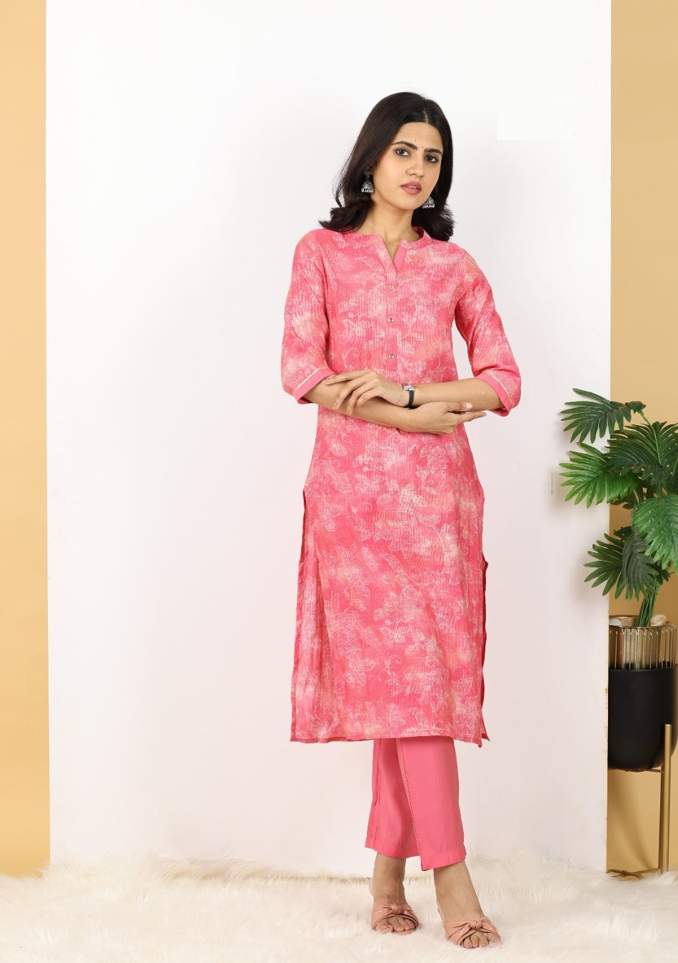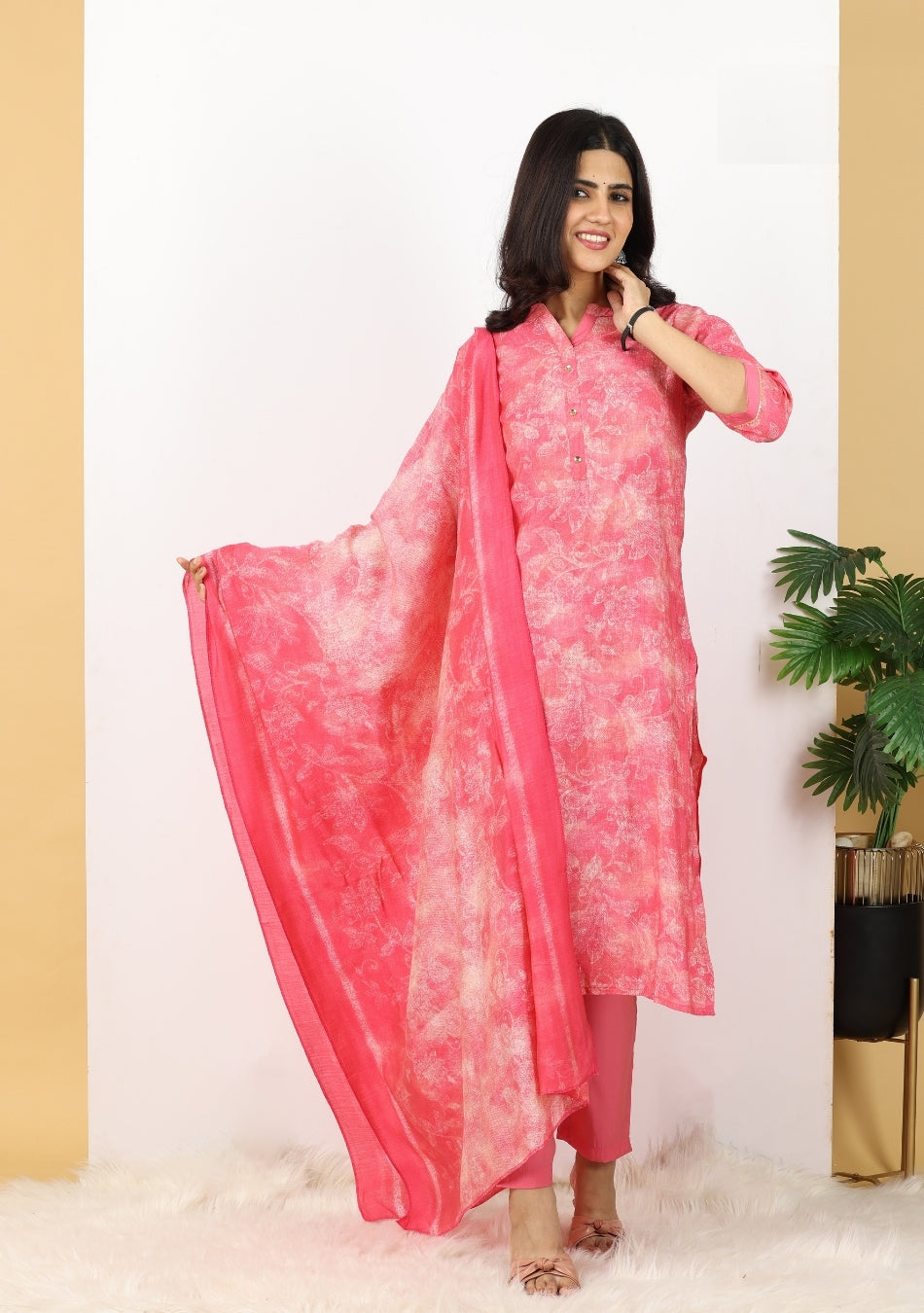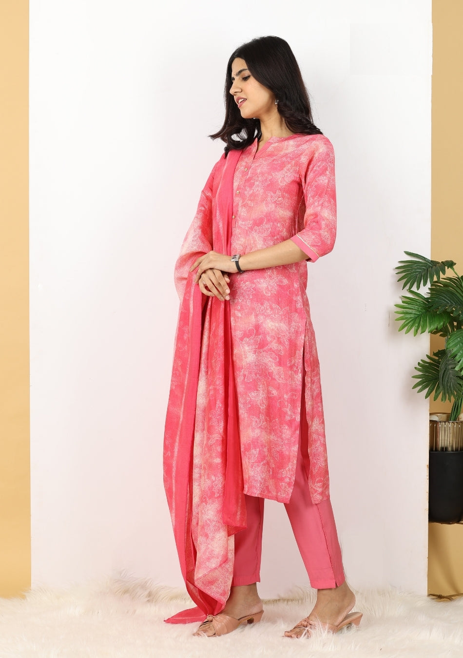 Infuse your wardrobe with vibrant energy with our Pink Fusion Ensemble Pant Set. This lively three-piece pant set features a delightful fuchsia pink kurta and matching straight-leg pants, offering a cheerful and comfortable base. The kurta is subtly adorned with an abstract, light-toned print, creating a tie-dye or watercolor effect. The ensemble is beautifully completed by a soft, flowing dupatta showcasing the same captivating print in varying shades of pink, adding a dynamic and artistic touch. Perfect for bright daytime events or adding a pop of color to your casual wear.