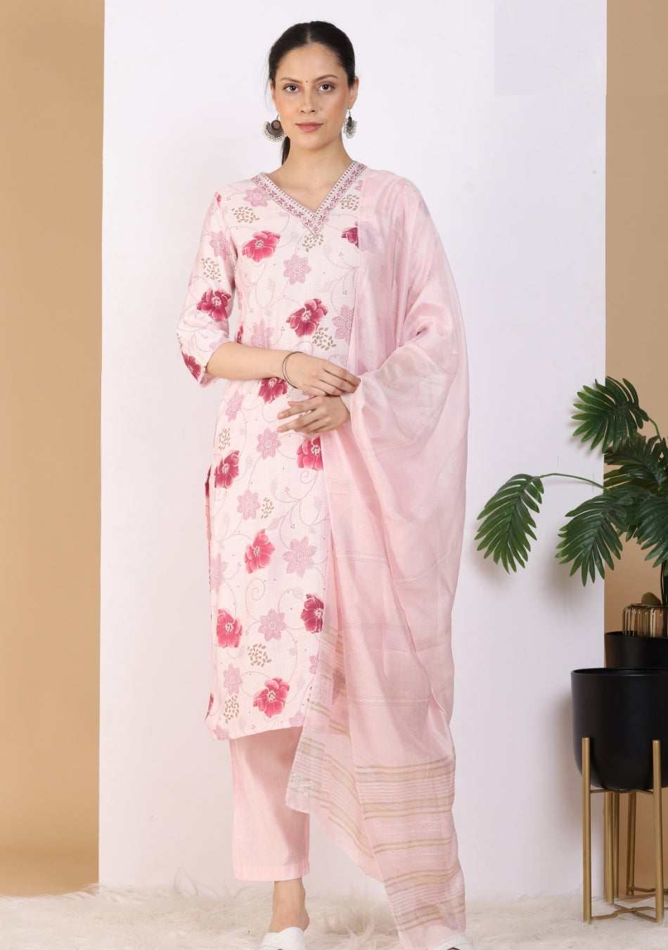Float in delicate charm with our Blush Garden Pant Set. This enchanting three-piece pant set features a soft, light pink kurta adorned with vibrant fuchsia and maroon floral prints, creating a sweet and lively design. The V-neckline is subtly embellished for a touch of elegance. Paired with comfortable matching straight-leg pants, the ensemble is completed by a sheer pink dupatta, highlighted with delicate gold stripes, adding a subtle shimmer. Perfect for a fresh and graceful look.