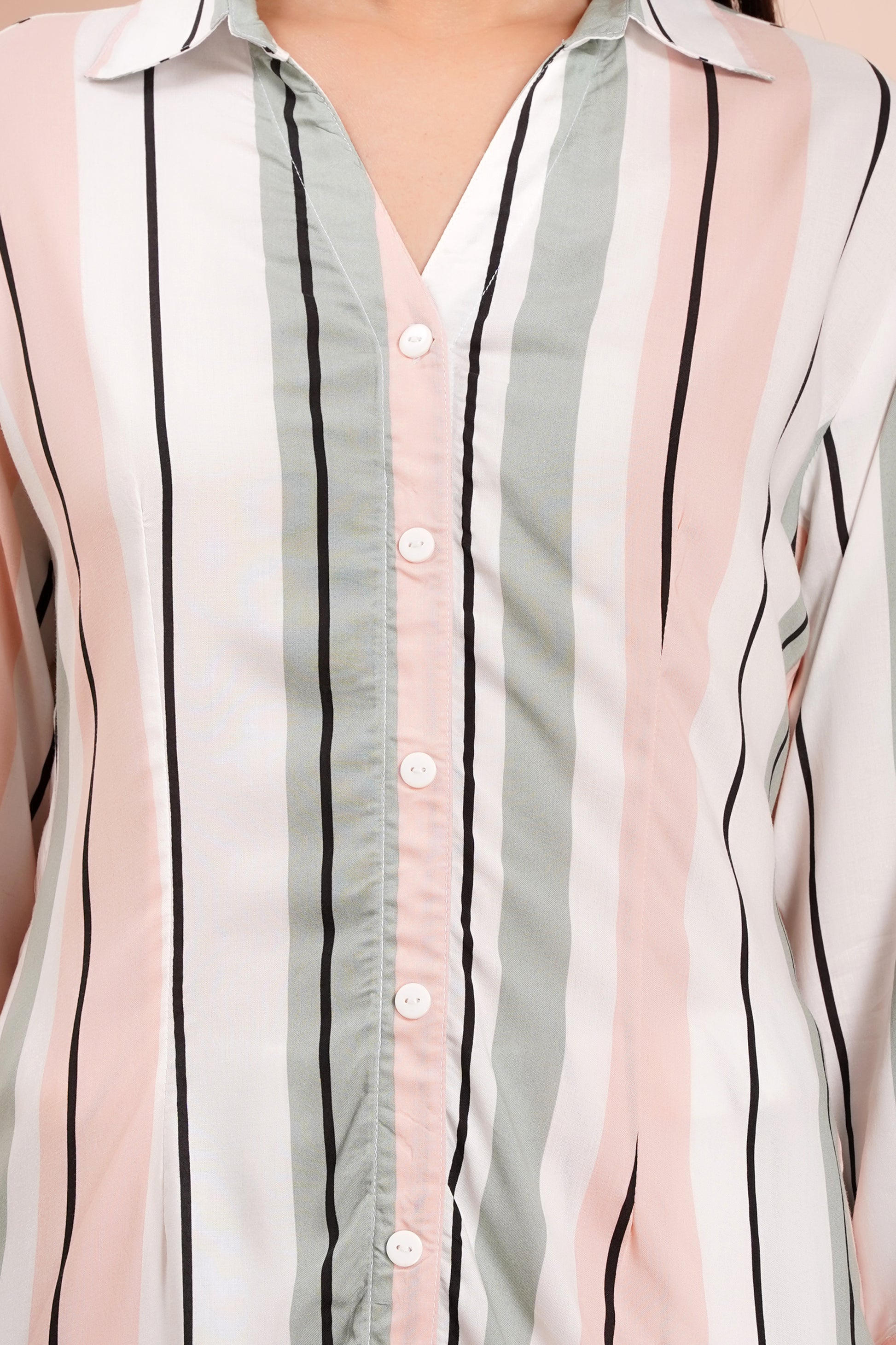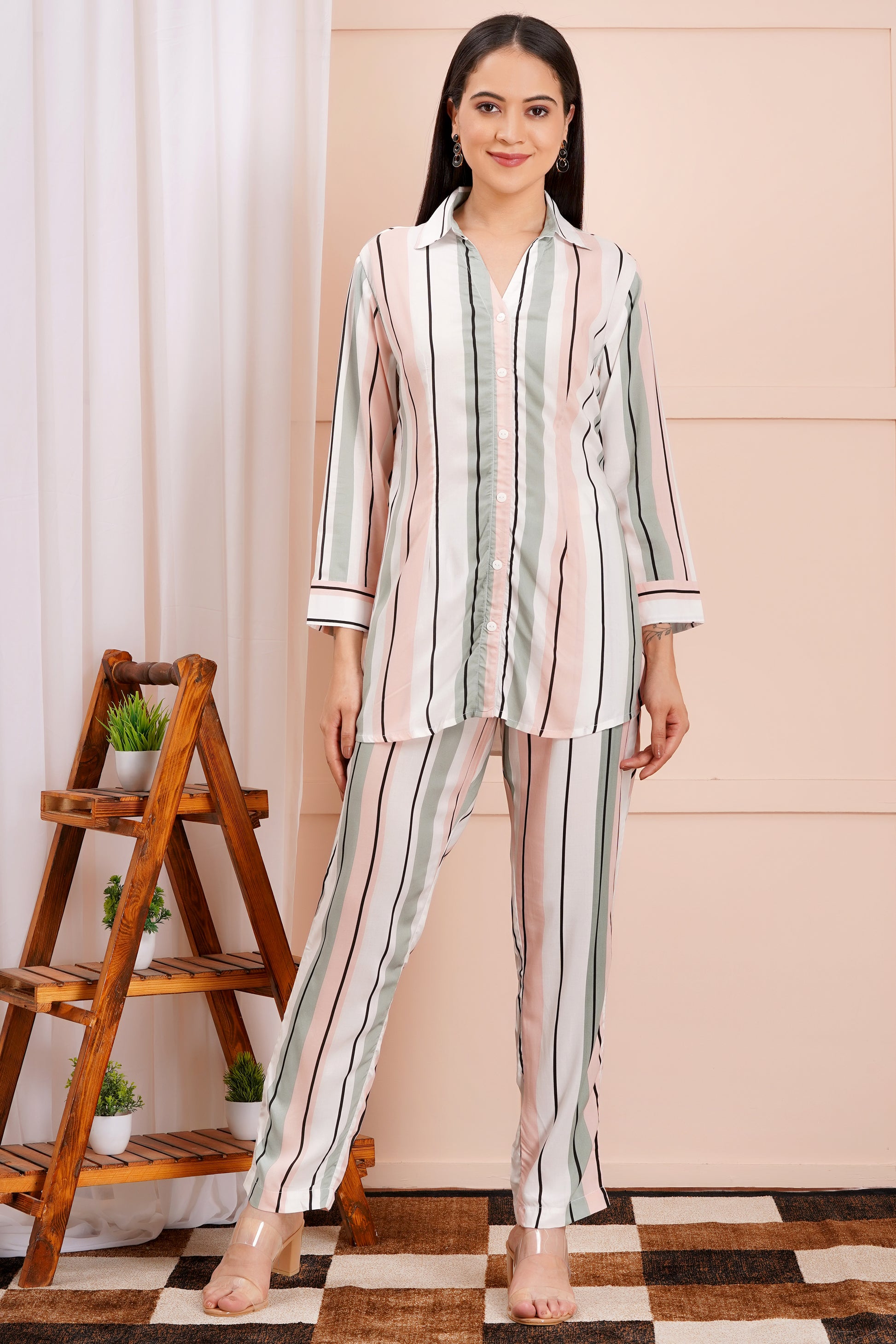 Make a bold statement with the Pastel Pinstripe Co-ord Set by Avyarna. Featuring an eye-catching print, this set blends modern elegance with effortless comfort. The relaxed-fit button-down shirt pairs perfectly with tailored straight-leg pants, creating a sophisticated yet casual look.