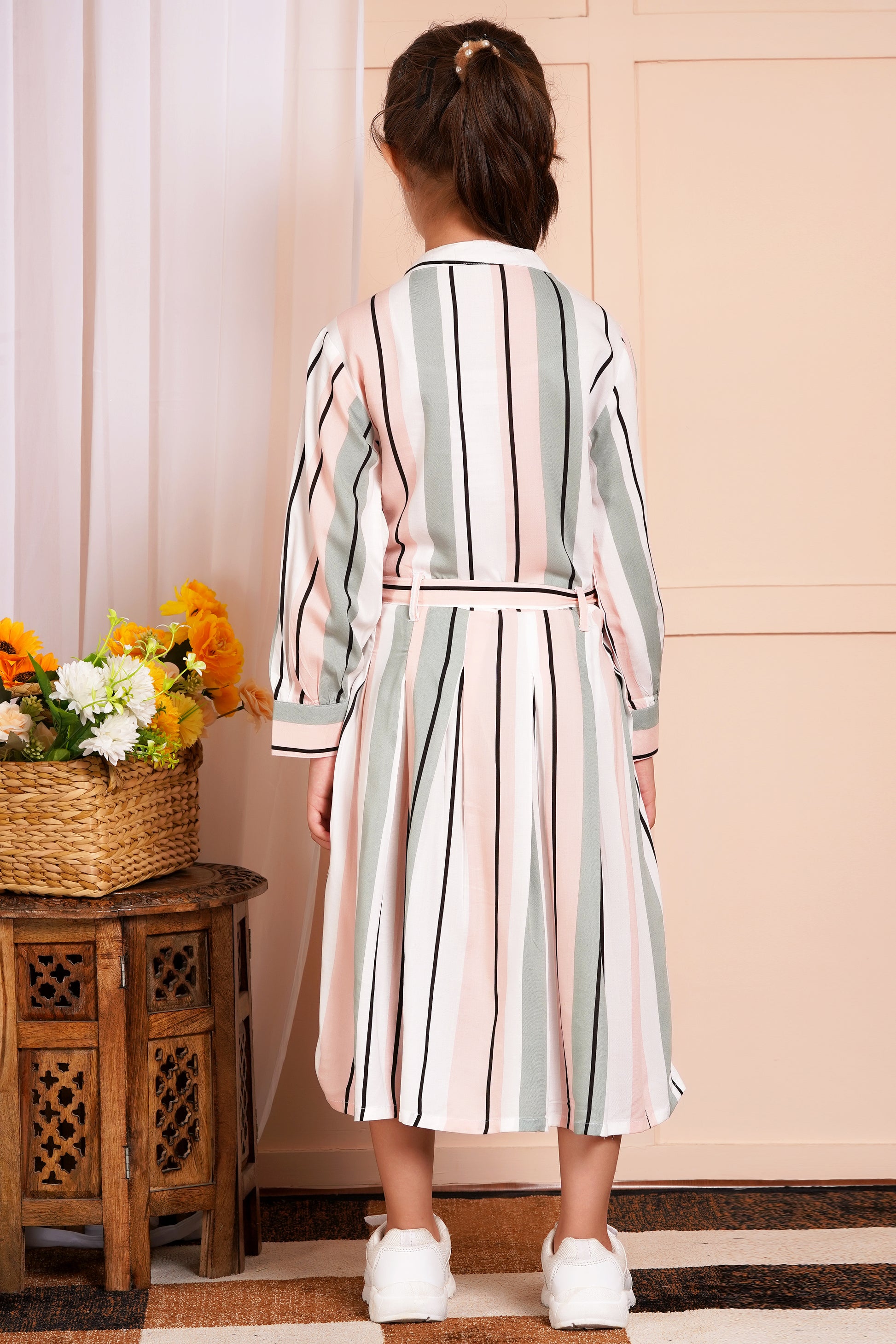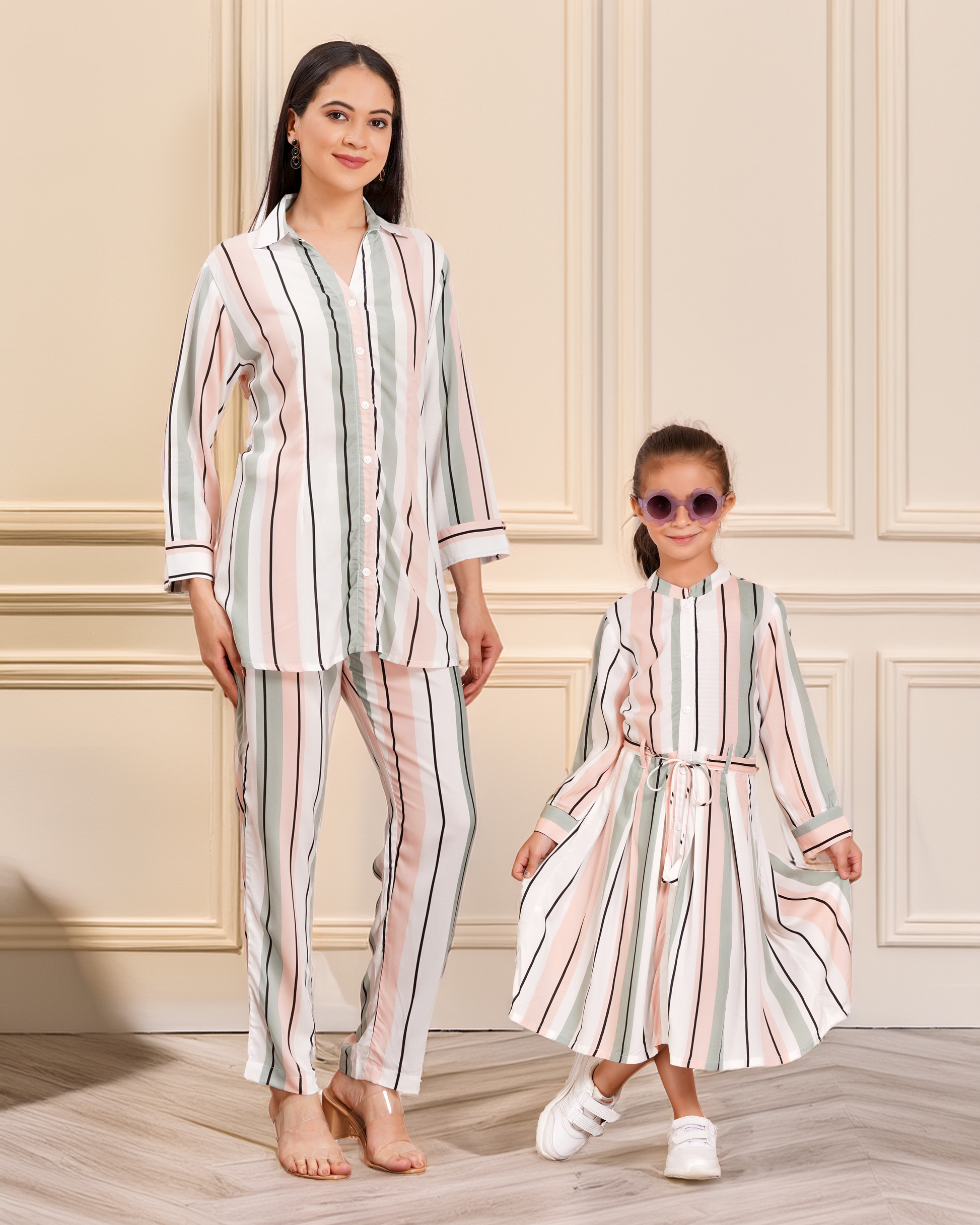 This delightful combo features elegant vertical stripes in soft pastel shades of pink, mint green, and classic black, set against a crisp white background. Crafted from a lightweight and breathable fabric, it ensures comfort and freedom of movement for all her adventures. The dress boasts a sophisticated mandarin collar and a full-button placket for easy dressing, while the three-quarter sleeves with buttoned cuffs add a touch of refined style. Chic, comfortable, and utterly adorable, the Pastel Pinstripe dress is a must-have addition to her wardrobe, perfect for embracing a touch of effortless elegance.