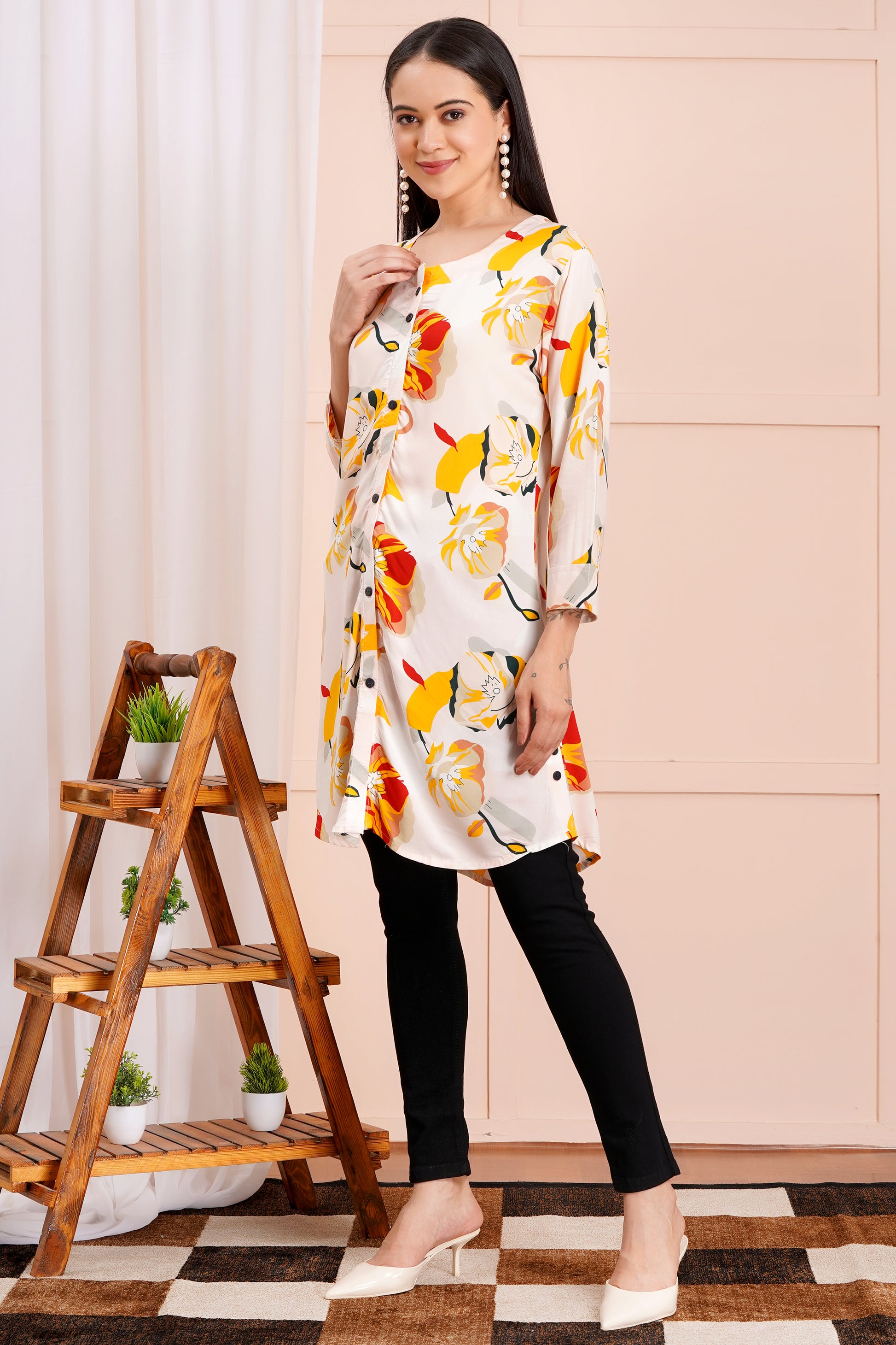 This Sunshine Bloom Short Kurti is crafted with fine-quality viscose modal fabric, very similar yet superior to rayon fabric in terms of quality, feel, comfort, and durability. You may choose from various size options starting from M up to 4XL.
