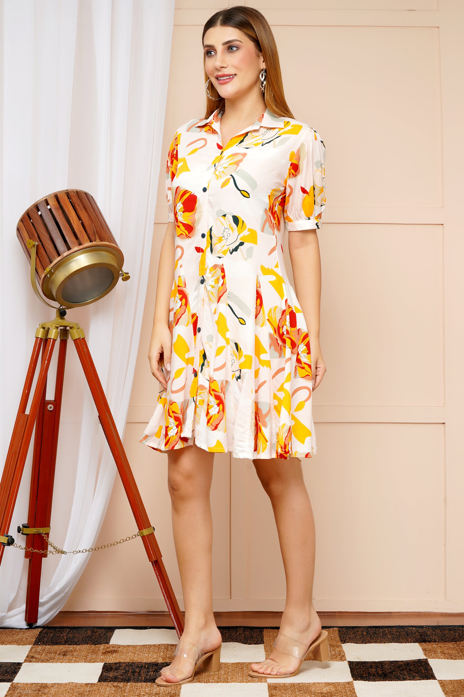 Embrace effortless style with the Sunshine Bloom Short Midi Dress by Avyarna. The lightweight fabric and flared hem create a flattering silhouette, perfect for warm days and breezy evenings.