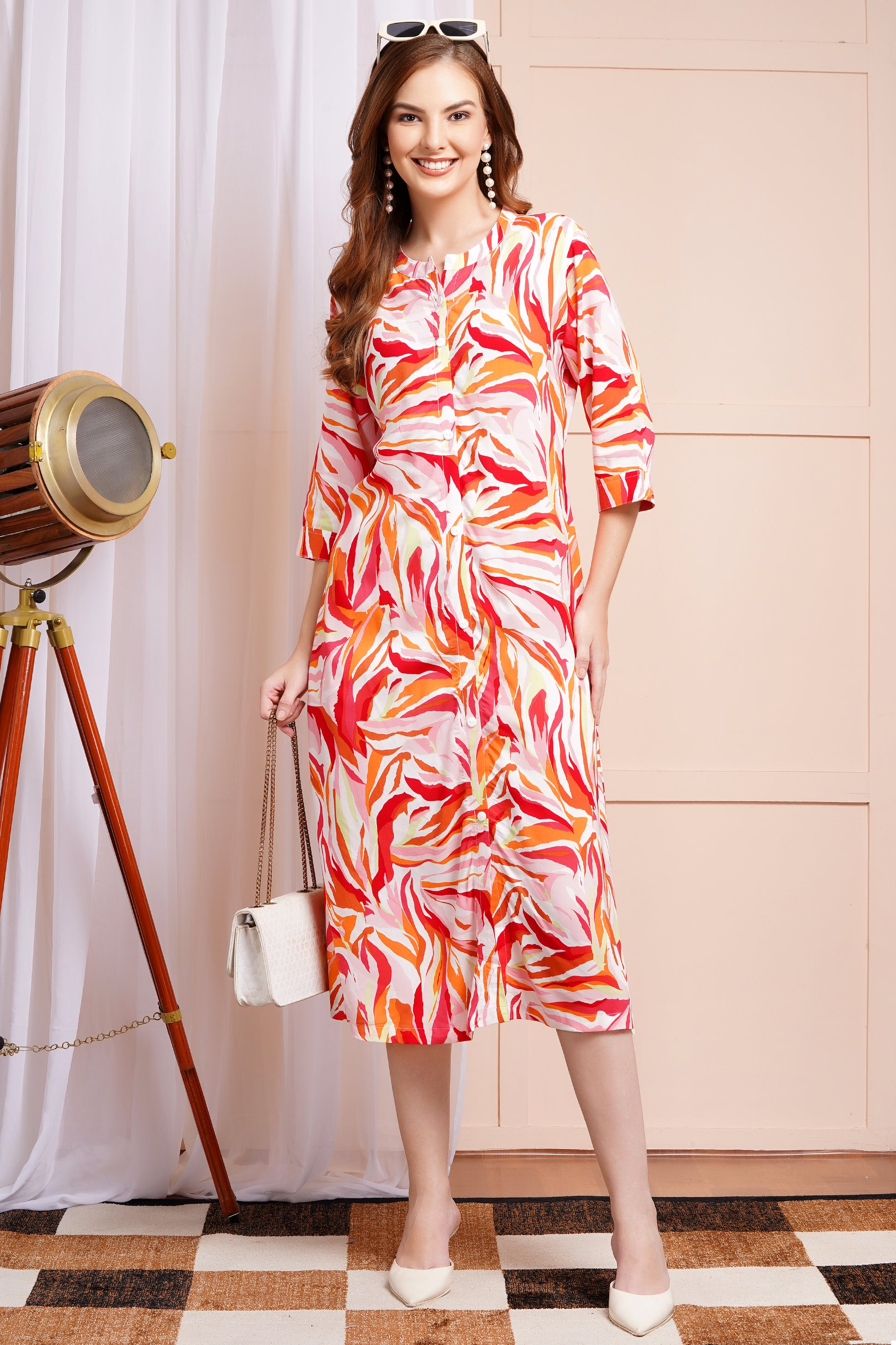 ✨ Key Features: ✔ Eye-catching print for a bold statement ✔ Relaxed A-line fit for effortless movement ✔ Lightweight fabric for all-day comfort ✔ Band Neckline and 3/4 th Sleeves