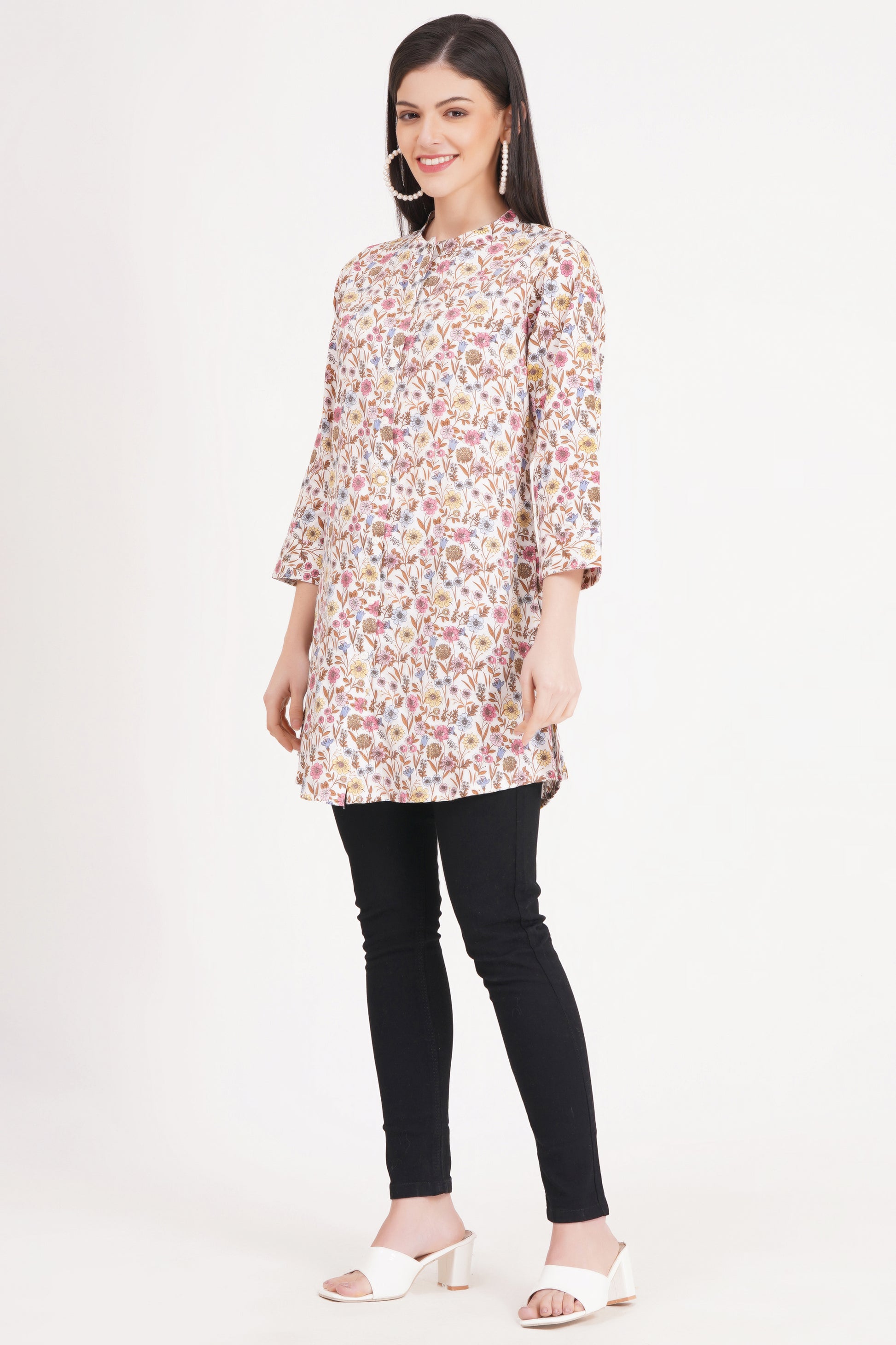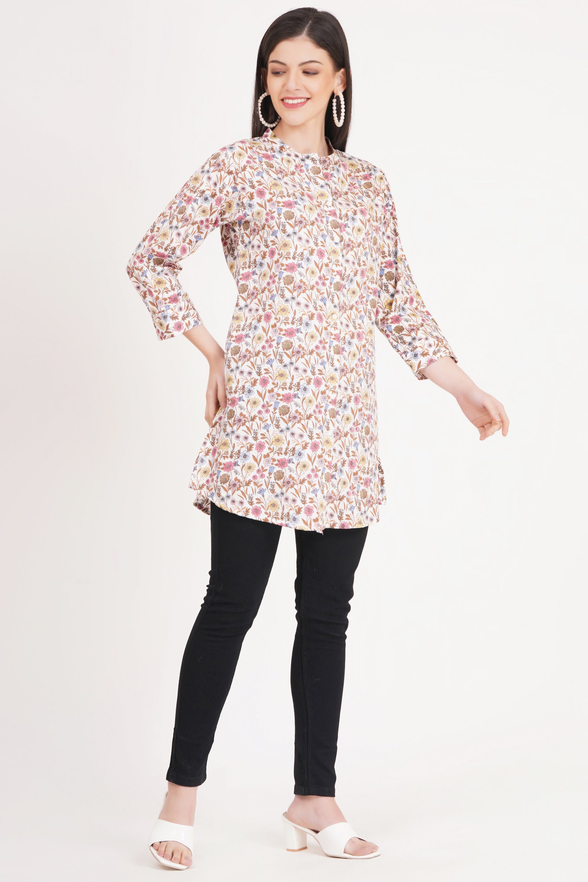 This Printed Short Kurti is crafted with fine quality viscose modal fabric, very similar yet superior to rayon fabric in terms of quality, feel, comfort and durability. You may choose from various size options starting from M up to 4XL.
