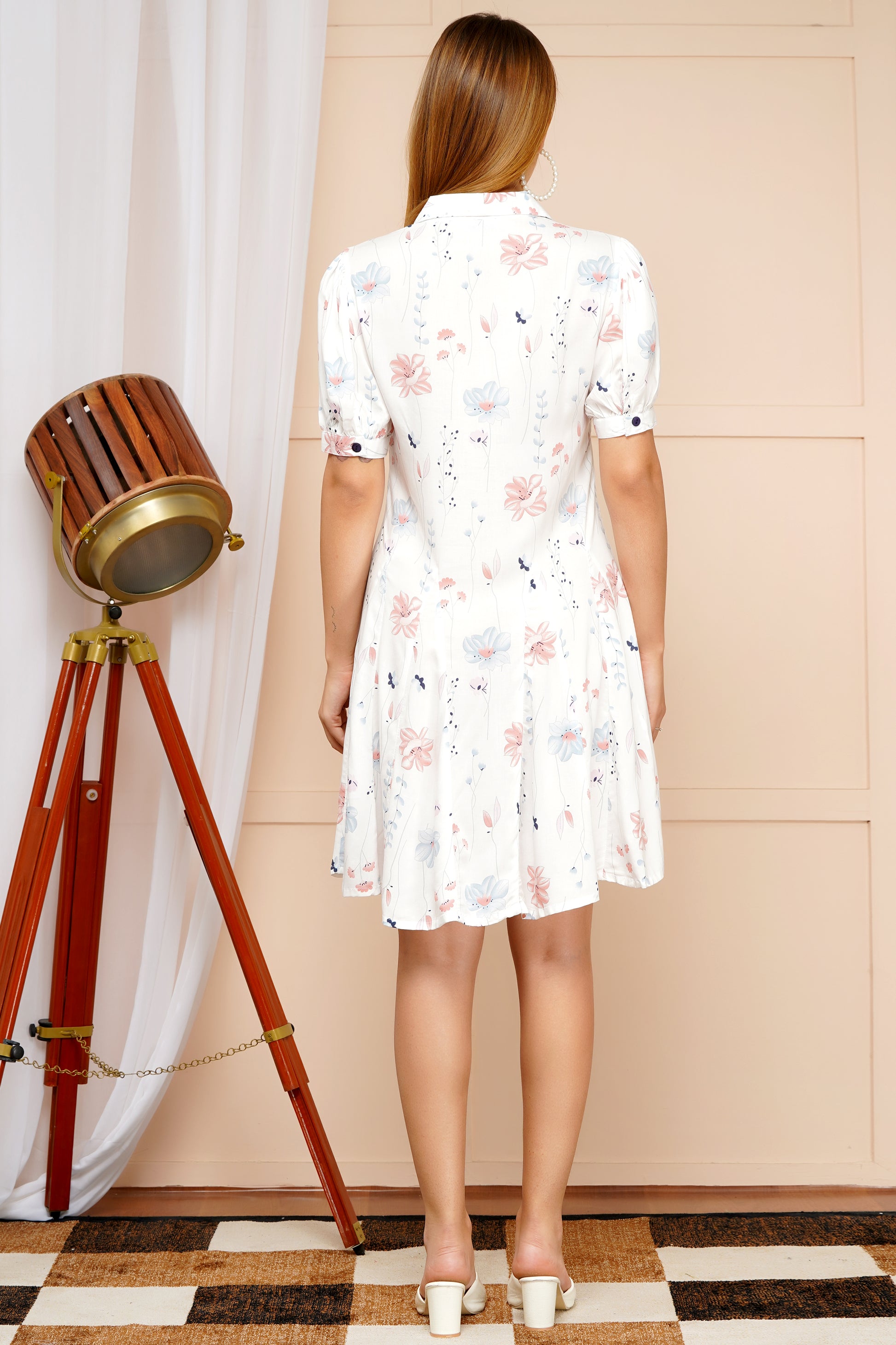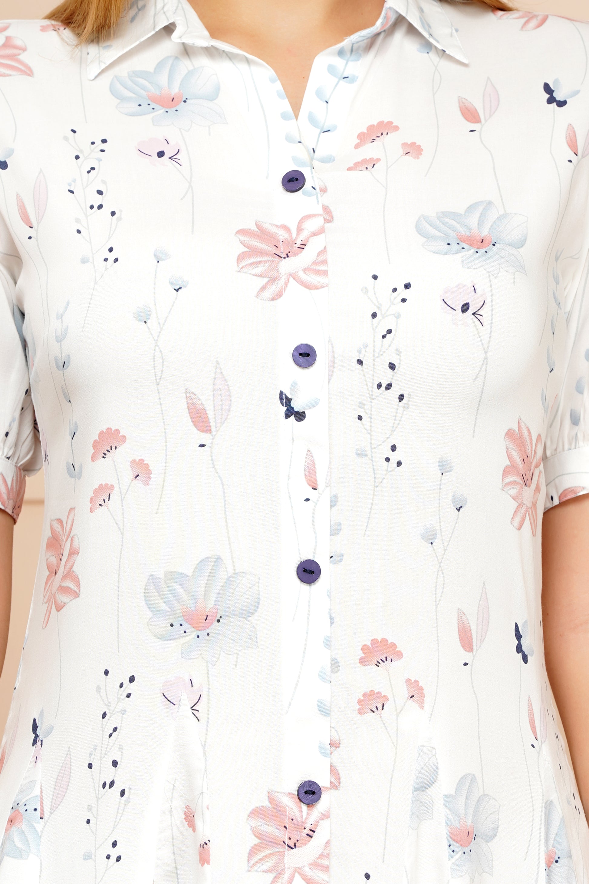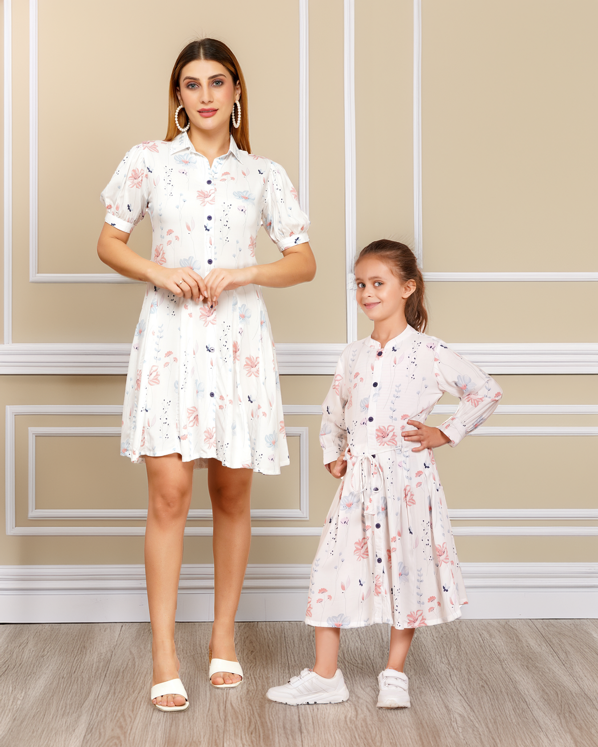 This enchanting combo is adorned with delicate floral and playful abstract prints in soft hues of pink, blue, and purple, perfect for adding a touch of charm to her day. Crafted from a light and breathable fabric, it ensures comfortable wear for all her activities. The dress features a stylish mandarin collar and a full-button placket with contrasting purple buttons for a pop of color and easy dressing. 3/4 sleeves with buttoned cuffs offer a polished look, while the self-fabric drawstring at the waist creates a lovely, adjustable silhouette.